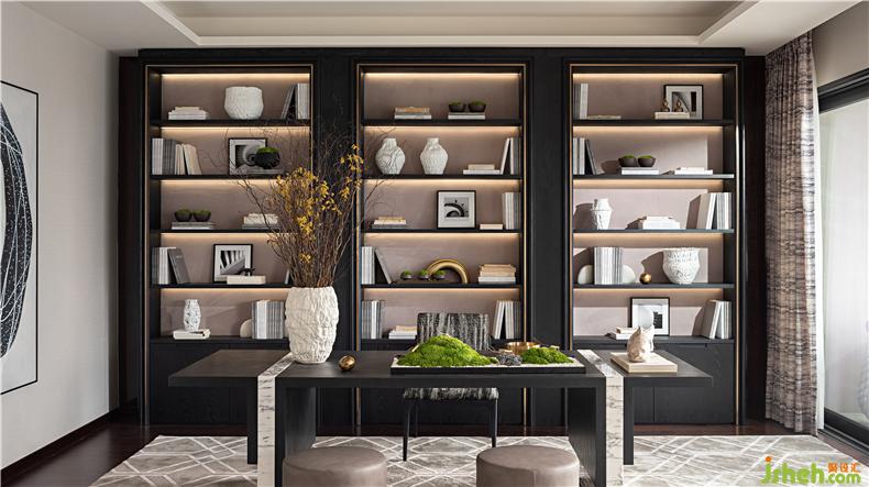 大氣非凡的偏廳,營造禪境的空靈與澄凈。書架在詩意光影中明暗交織、清雋有致,綠意深覆讀書堂,賦予空間獨特的審美特質(zhì)和精神氣格。