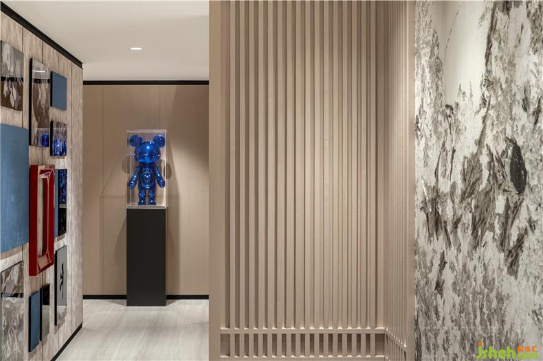 邁向休憩區(qū)的長(zhǎng)廊營(yíng)造成一個(gè)藝?yán)瓤臻g,以紅藍(lán)撞色充分彰顯出項(xiàng)目大膽的‘玩趣’,樣板房設(shè)計(jì)藝術(shù)品的重色與墻面的淺色呼應(yīng),又形成靈動(dòng)的層次感。 充滿科技未來(lái)超酷感的原版星際熊×藝術(shù)家 Kaws 的涂鴉與標(biāo)志性的“XX”眼,彰顯出室內(nèi)空間不凡的藝術(shù)張力,業(yè)主漫步藝術(shù)長(zhǎng)廊進(jìn)入靜謐的休憩區(qū)時(shí),時(shí)間仿若化為曼妙的音符,流淌于空中。