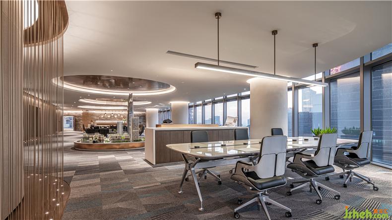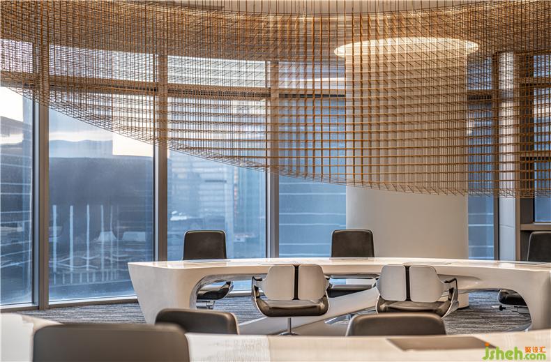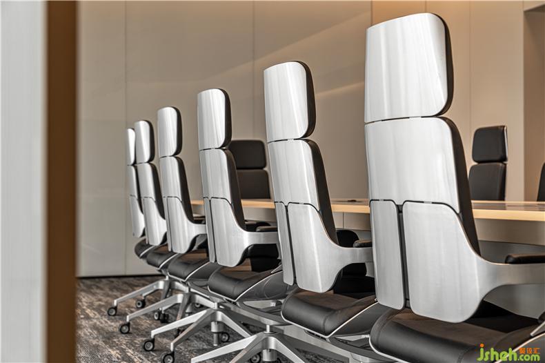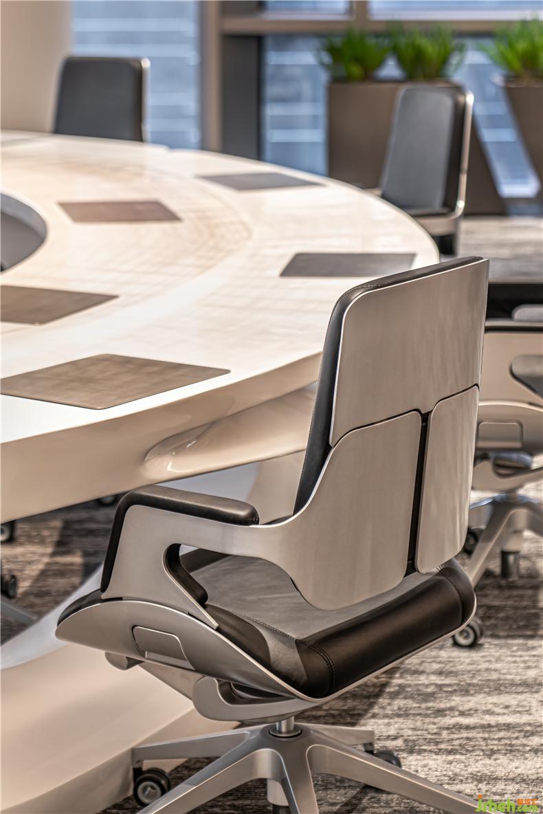 改變傳統(tǒng)的辦公空間布局,開放式辦公展示區(qū)以圓形空間主導(dǎo),白色玻璃鋼材質(zhì)的圓桌,以及銀色德國制造鋼板手扶辦公椅,造型前衛(wèi),充滿未來感,頂部螺旋狀弧形金屬罩造型,宛如宇宙星云環(huán)繞,與弧形辦公桌上下呼應(yīng),如太空艙主控臺一般,形成一個(gè)聚合能量場。