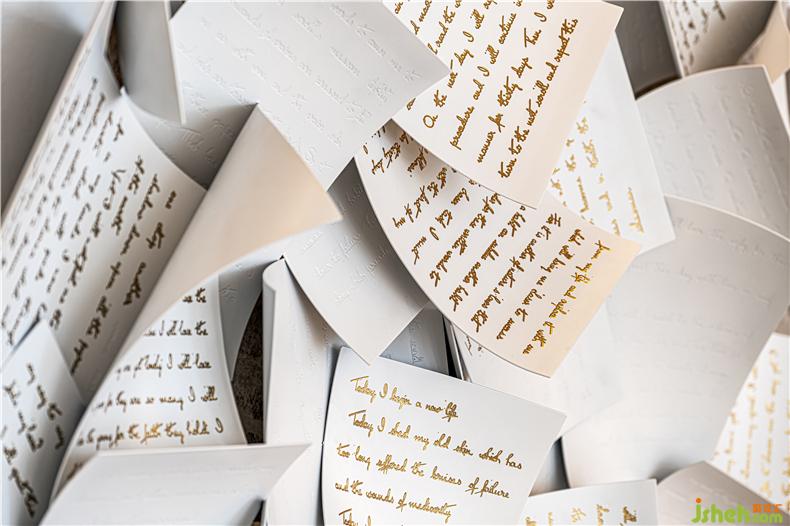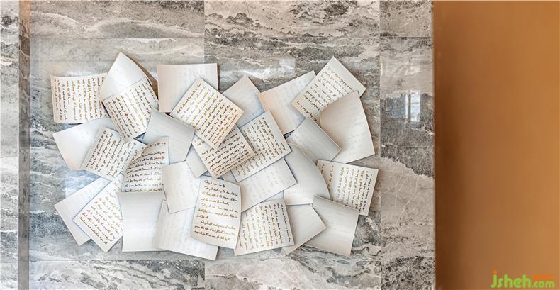 會議室與影音室一側(cè)的墻面上,設(shè)計(jì)師放置了一組辦公便簽/文件主題的金屬材質(zhì)藝術(shù)掛飾。畫面為一組寫著字跡的紙張,像被風(fēng)吹過散落一地的感覺,又像是辦公室頭腦風(fēng)暴留下的文件,飛揚(yáng)起來被定格的一幕,辦公室設(shè)計(jì)藝術(shù)家將其融入藝術(shù)創(chuàng)作,再現(xiàn)工作氛圍中當(dāng)下的永恒瞬間。