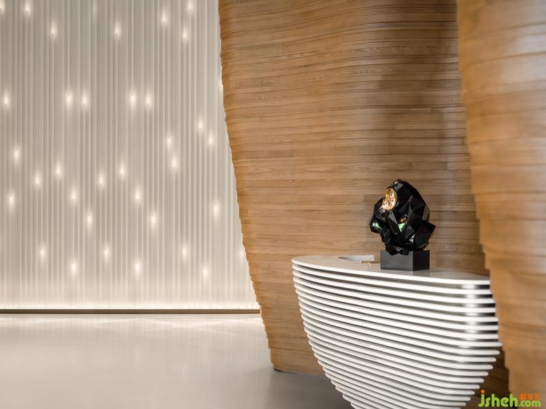 售樓中心設(shè)計(jì)不是一種技能,而是捕捉事物本質(zhì)的感覺能力和洞察能力。接待區(qū)以山川峽谷為形,流動(dòng)光影為意,橫是層巒疊嶂,縱是深林幽靜。峽谷盤旋而上,用曲線構(gòu)建了一個(gè)舞臺(tái),變幻于虛幻與現(xiàn)實(shí)間,沉浸于行云流水般的空間中翩翩起舞,美學(xué)與自然形成了強(qiáng)烈的互動(dòng)與完美的融合。
