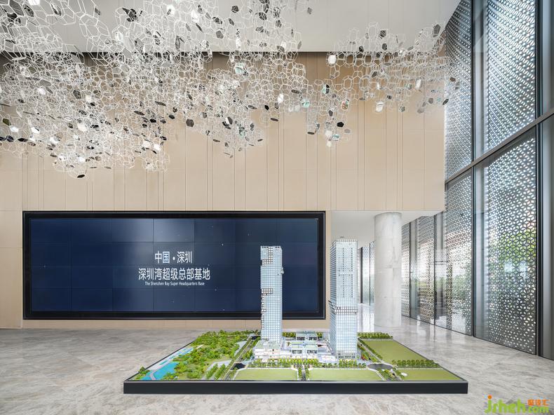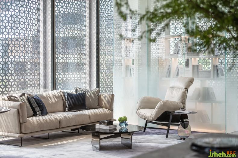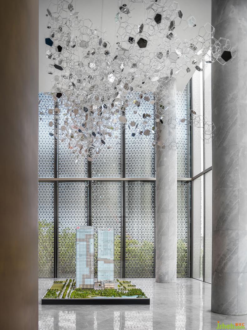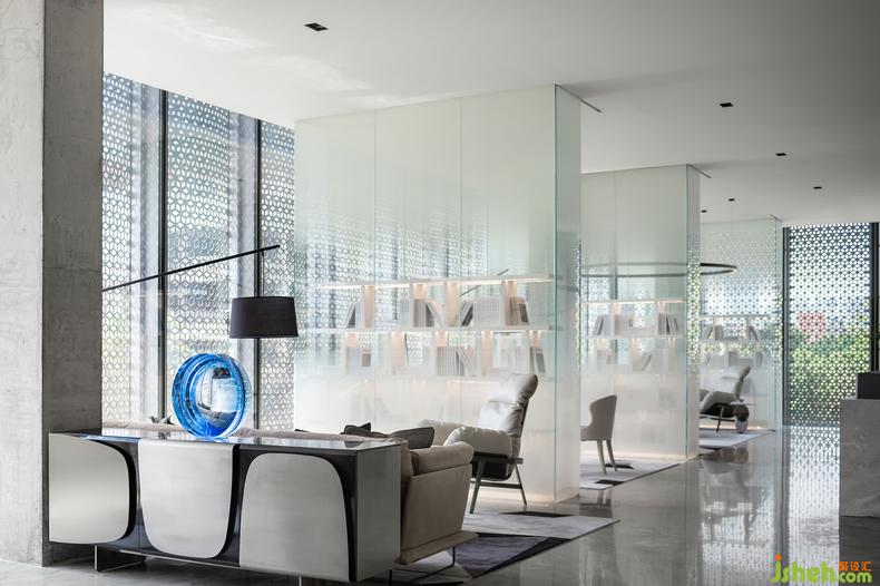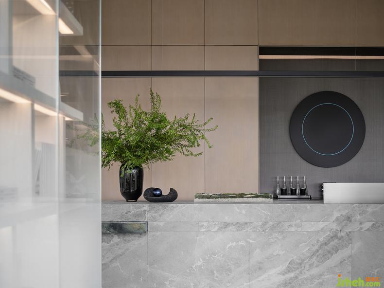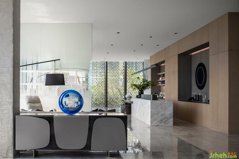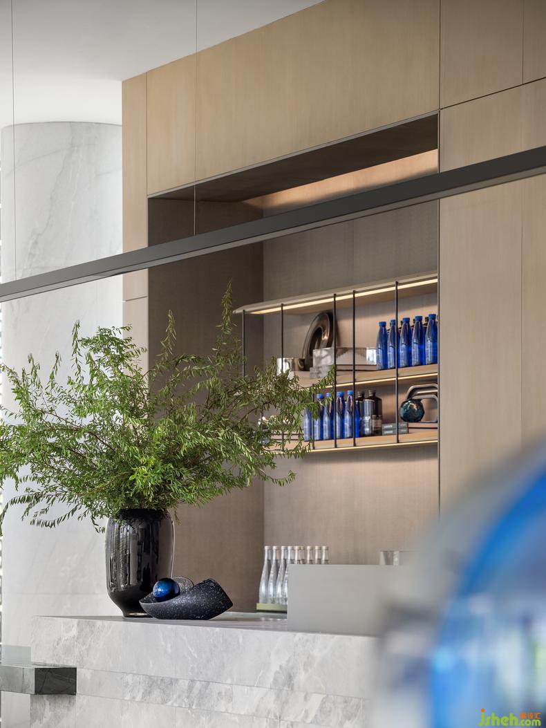將自然寫進生活,一切為提前上演未來生活而服務。水吧區(qū)的藝術裝置品《破·曉》將現(xiàn)代與未來相連結(jié),靜謐的藍宛如沖破時間縫隙的光,初始熹微,繼而透亮。色彩運用干凈利落,空間氛圍在和諧中體現(xiàn)統(tǒng)一。