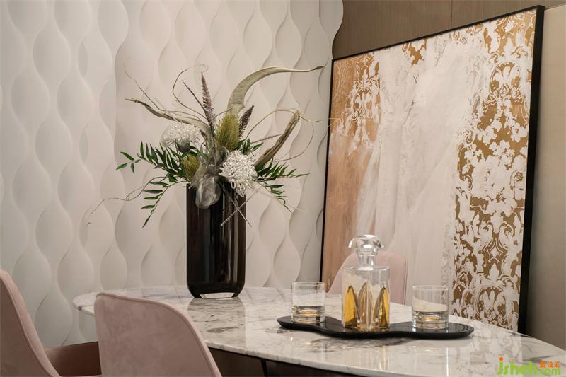 餐廳空間整體色彩以淺白色為基調(diào),搭配自然紋理的大理石餐桌與肆意伸展的綠植擺件,空間質(zhì)感與美學(xué)性十足