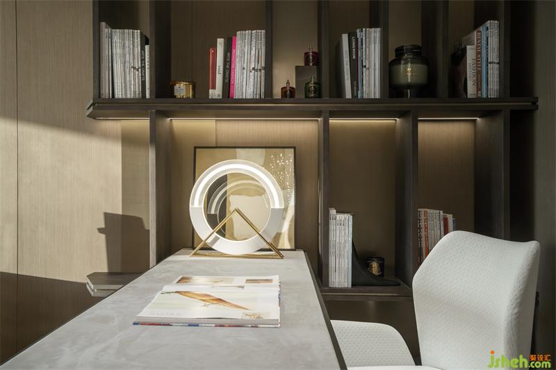 擺畫(huà)布景,壁架置物,書(shū)房空間處處可觀詩(shī)意芳華。無(wú)論是伏案工作,亦或是休息閱讀,書(shū)架的書(shū)籍散發(fā)出強(qiáng)烈的秩序感,靜謐的環(huán)境總能增添更多的空間美學(xué)