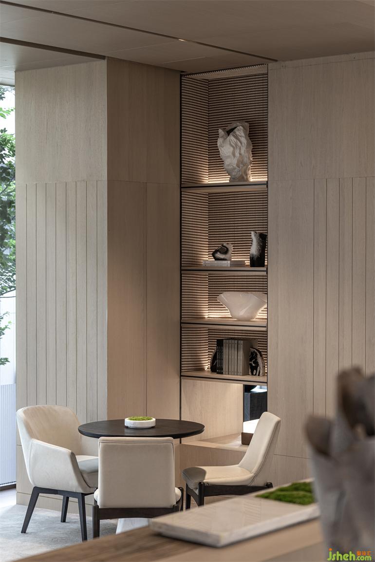 一步一景,充滿原生態(tài)感的藝術(shù)雕塑,小景美而精,手工磨砂玻璃在此為點睛之筆,深圳營銷中心設(shè)計霧面肌理營造出柔和的光澤,豐富了空間質(zhì)感。
