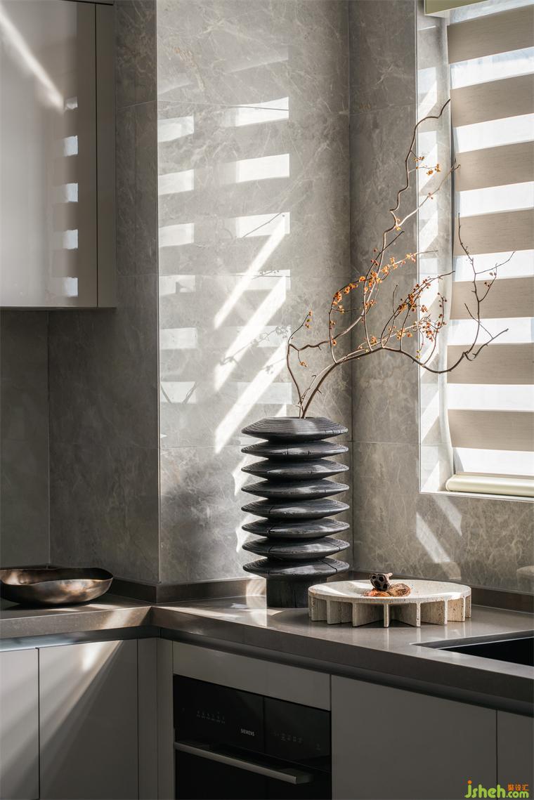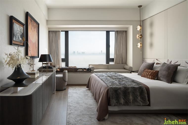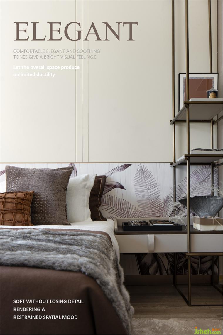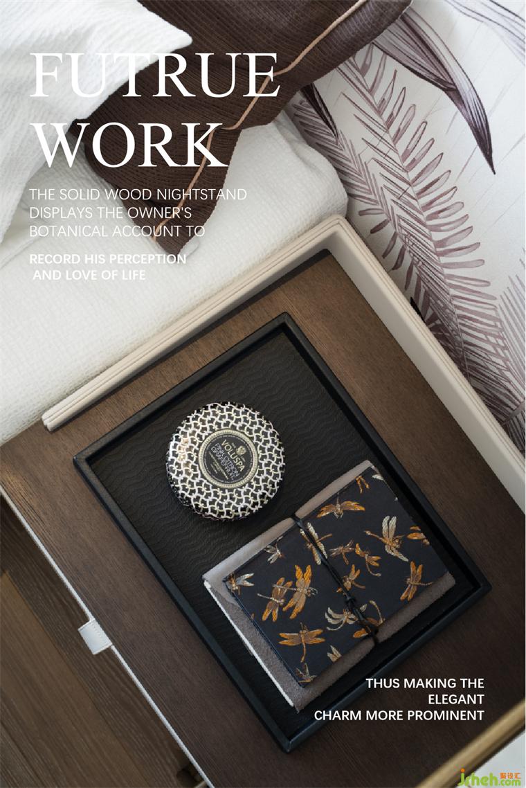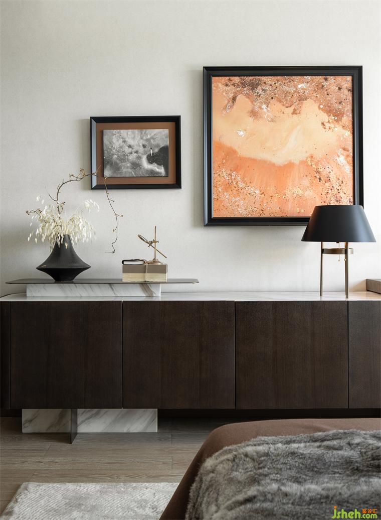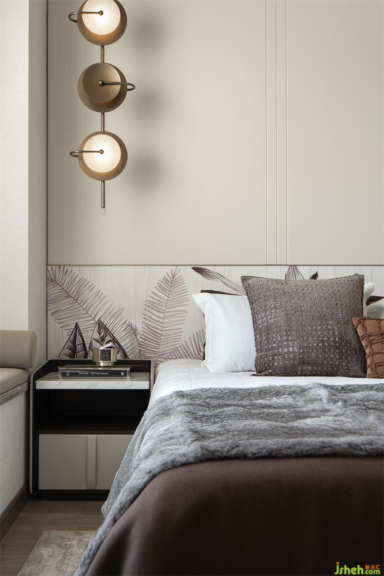 實(shí)木床頭柜展示著主人的植物手賬,樣板房設(shè)計(jì)記錄了他對生活的感知與熱愛,臺燈與藝術(shù)花器錯落有致,從而讓雅致的韻味更為突出。
