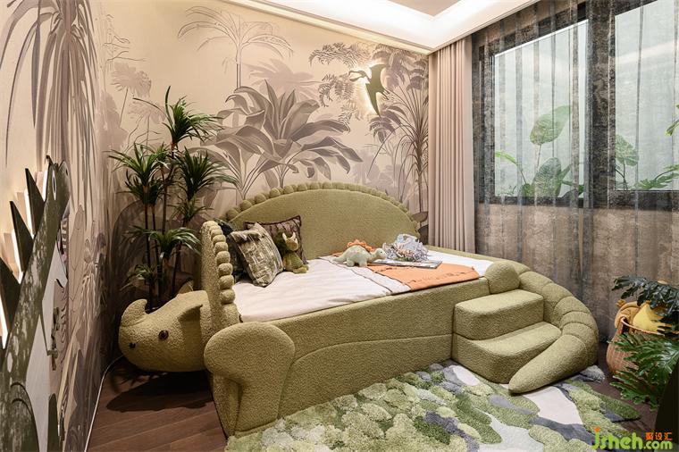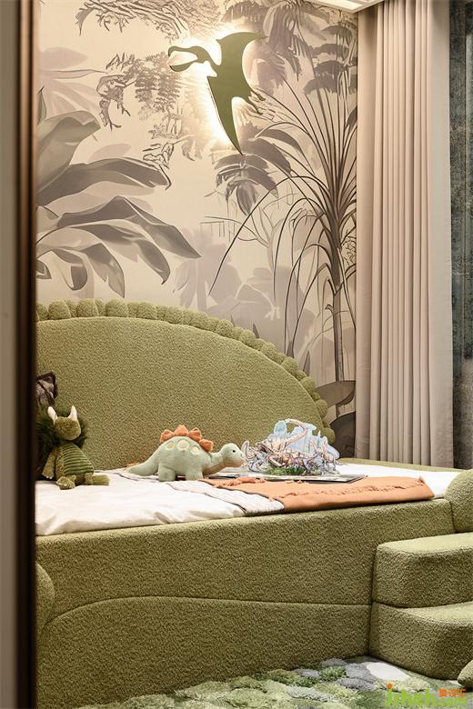 男孩房仿佛置身於一個童話與自然交織的夢境中。牆上的植物圖案在燈光的映襯下,仿佛要從牆麵躍然而出,增添生機(jī)與活力。