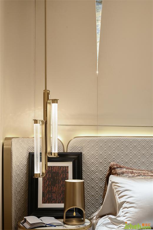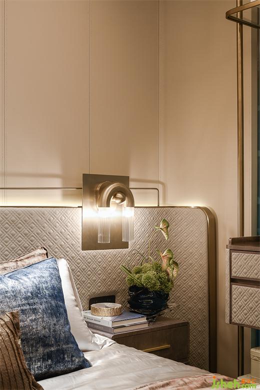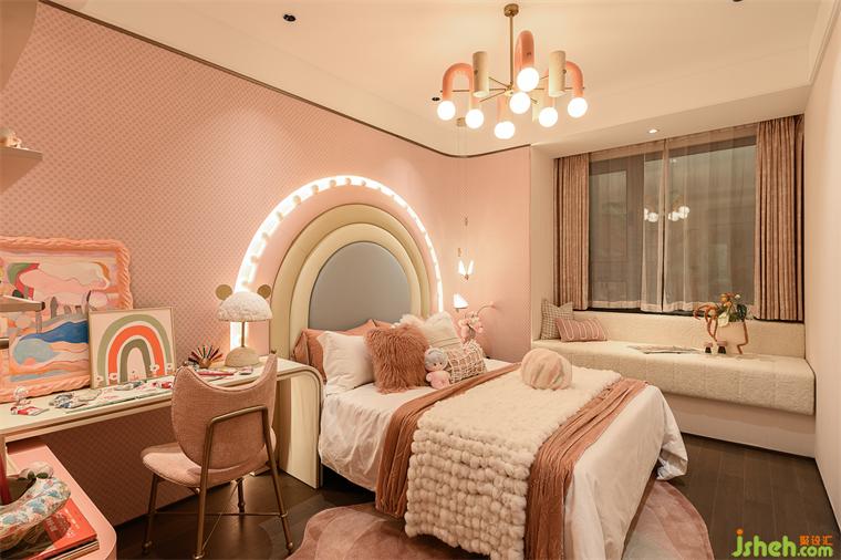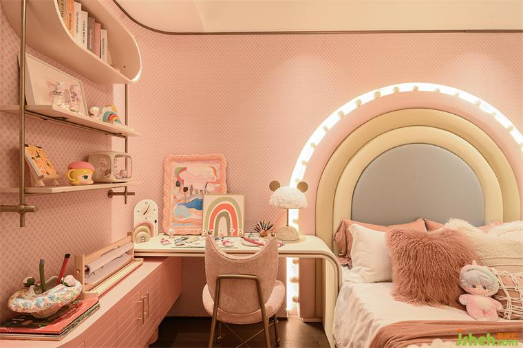 女孩房宛如綺麗之境,弧形的床頭背景如同一道柔和的彩虹,微光閃爍。粉色調(diào)的牆麵與柔軟的佈藝相得益彰,樣板房設(shè)計營造出一個既溫馨又充滿幻想的空間。