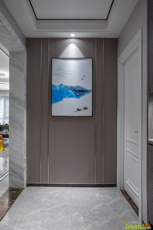 過道采用黑白灰搭配簡約線條,營造出簡潔而現(xiàn)代的空間感受,山水畫勾勒表現(xiàn)的意境和格調(diào)呈現(xiàn)出一種寧靜致遠的感覺。