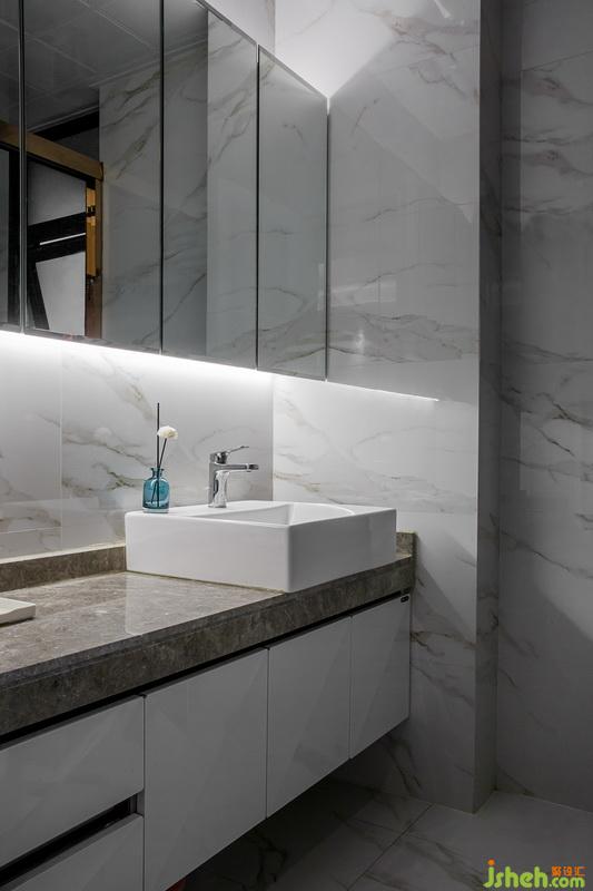 在公衛(wèi)的設計上,室內(nèi)設計師全部采用大理石臺面,用簡單的白色墻磚搭配灰色臺面,使得空間更加穩(wěn)重簡潔。鏡柜加不銹鋼地柜的設計完美收納所有雜物和化妝品。