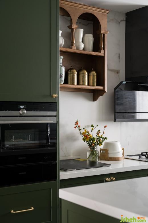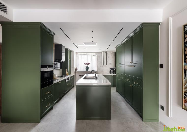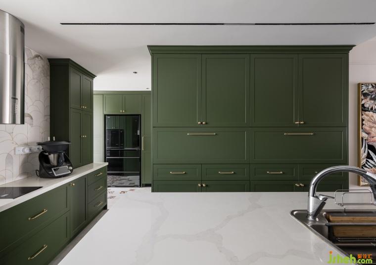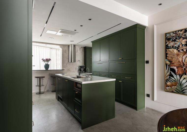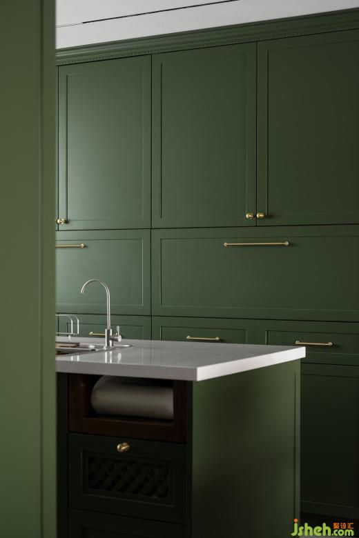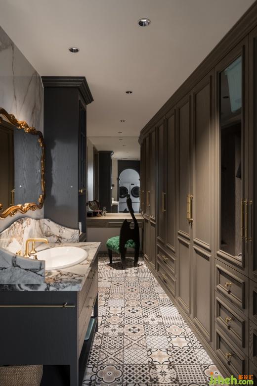 衣帽間融入了復(fù)古花磚點綴,綠色椅子呈現(xiàn)出獨有的品位,顏色搭配主打濃郁深沉,每一處角落都彌漫著日時光的迷人魅力。