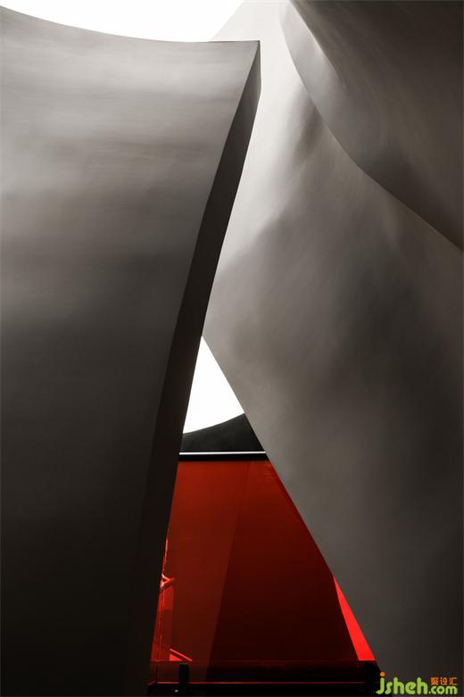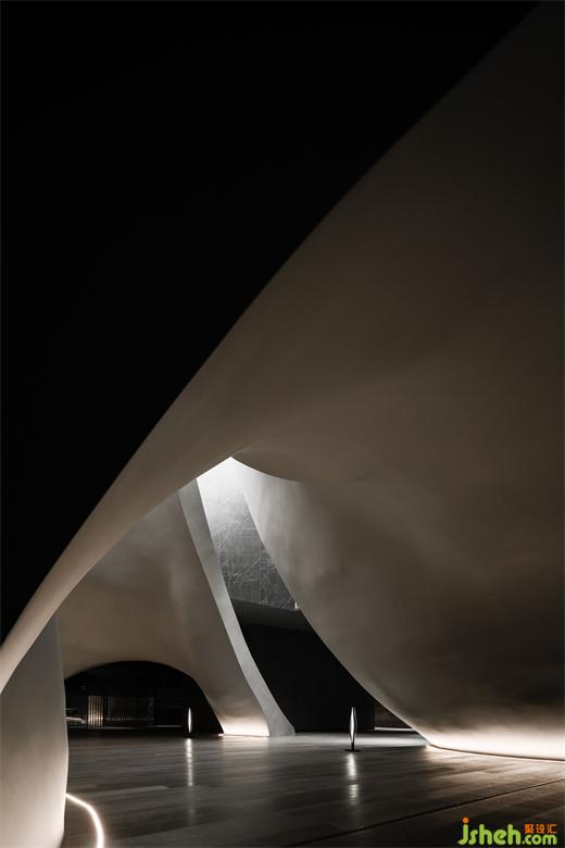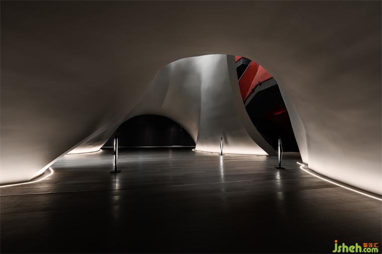 涵洞般的入口被設(shè)計(jì)為一條時(shí)光隧道,讓人想起經(jīng)典科幻電影《2001太空漫游》中的信息流場景。展廳設(shè)計(jì)漆黑光滑的表面上,反射著地面上紅色霓虹曲線的散碎光點(diǎn),模糊曖昧。