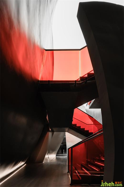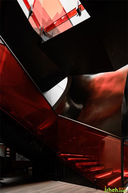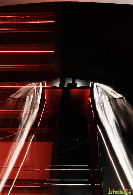 The cavernous entrance is conceived as a time tunnel, evoking the iconic information flow scenes from the classic sci-fi film2001: A Space Odyssey. On the dark, smooth surface, the reflection of the red neon curve breaks, scattering into points, and creating a blurred and ambiguous ambiance.