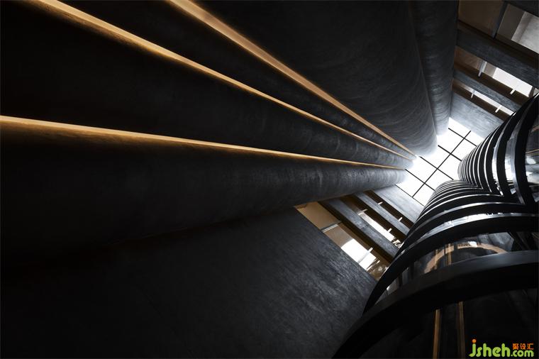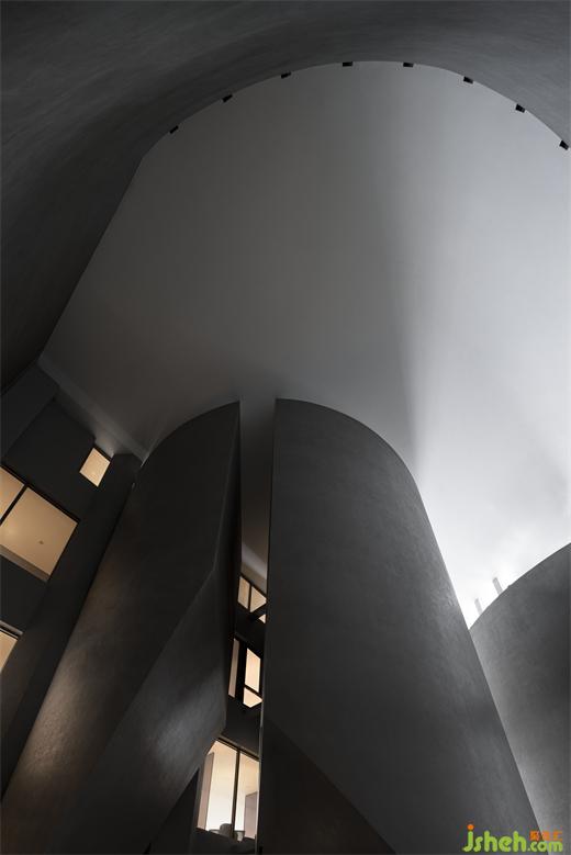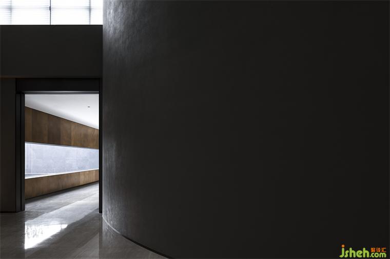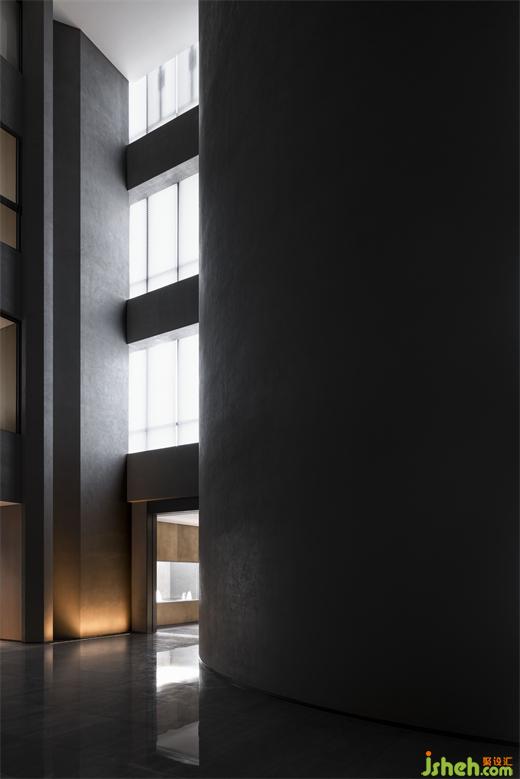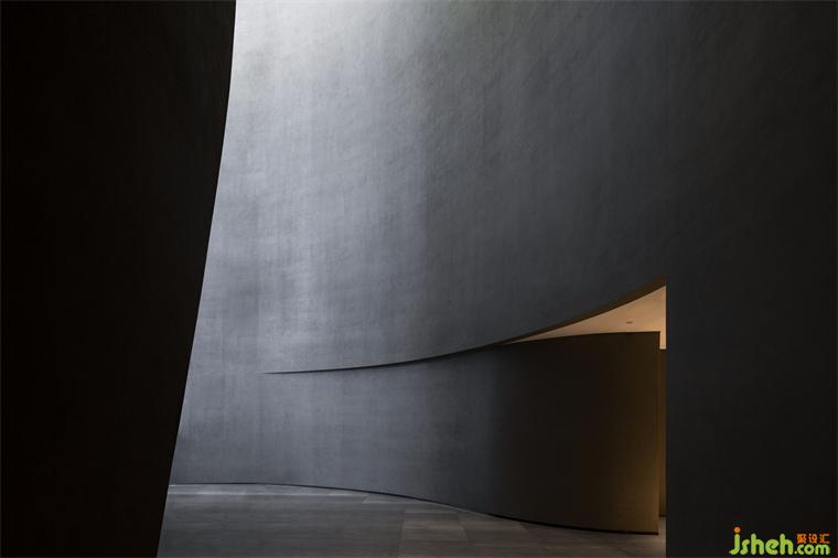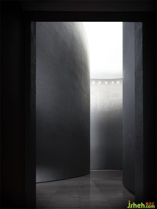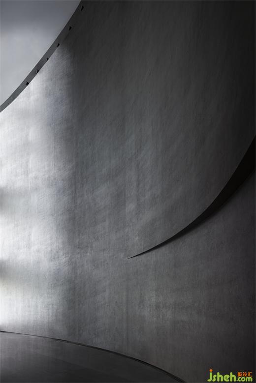 度假酒店設(shè)計(jì)長長的弧形墻面如風(fēng)化的山石,尺度宏大、厚重古樸、不加裝飾,具有滄桑的力量感。約四層樓高的極致灰色體量,在寸縷天光的照射下讓人想起信仰空間的神圣以及柏拉圖的“洞穴隱喻”,彰顯出沉靜而深邃的磅礴之勢(shì)。