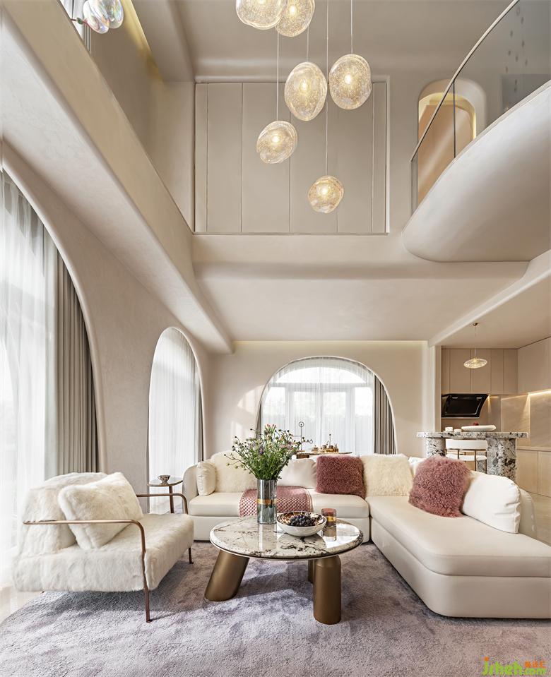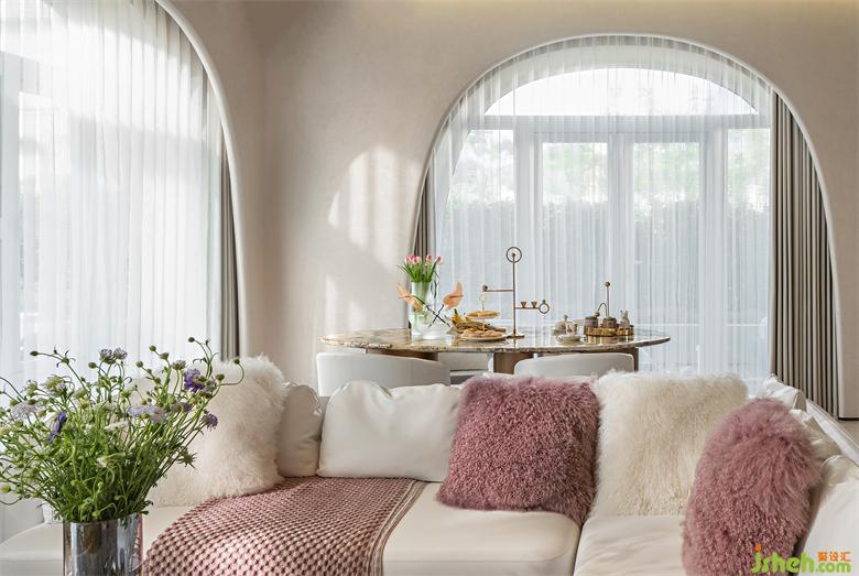 兩面墻的圓拱形玻璃門,將180度的自然景色引入,重慶樣板間設(shè)計(jì)俯仰之間的新鮮綠意替代了人們對(duì)于電子設(shè)備的依賴,在這里,你可以像“千尋”一樣的充滿活力、好奇、熱愛清風(fēng)與陽光,對(duì)花花草草有著少女的想象,重新去感受陽光灑下來的熱度。