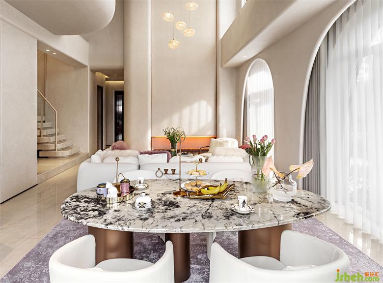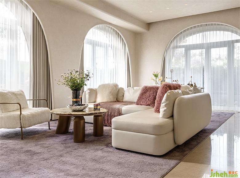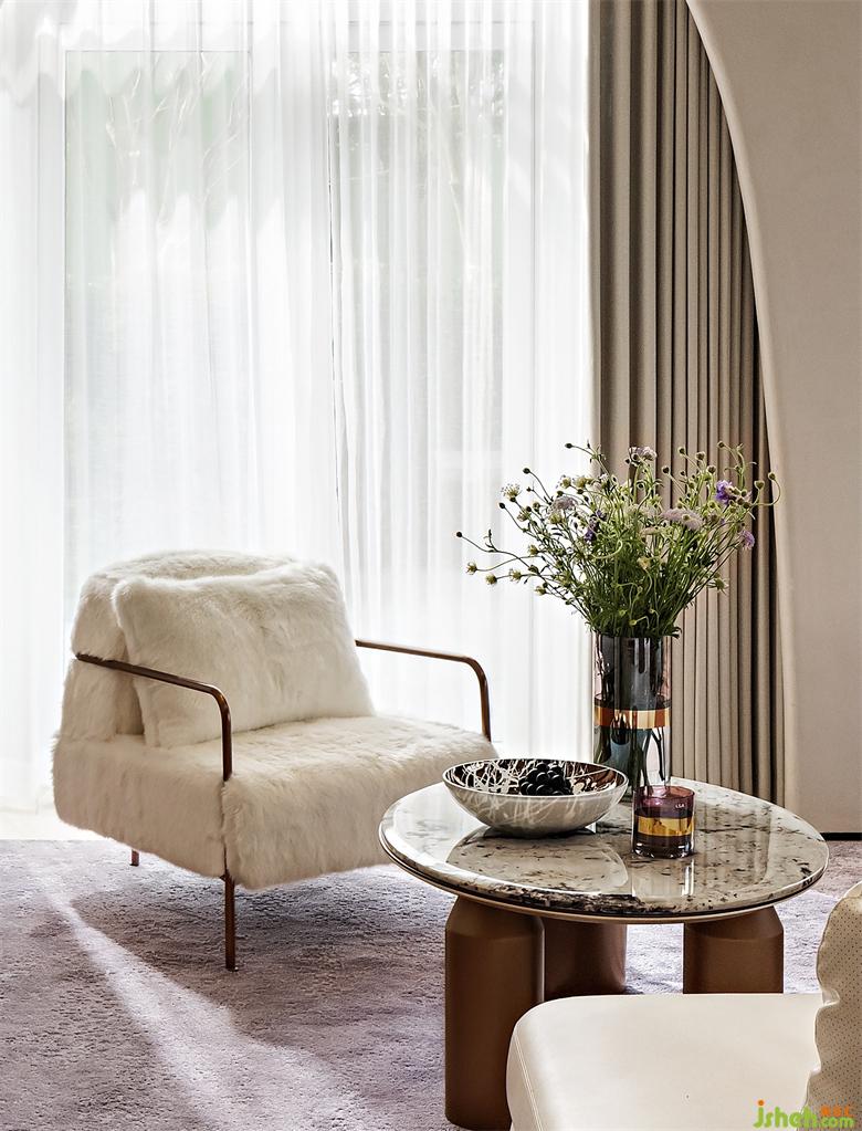 弧線感的家具與建筑呼應(yīng)成一體,木槿紫地毯巧妙的打破了空間沉悶感,在優(yōu)雅格調(diào)的另一面,把印象帶回《千與千尋》的紫暮晚霞。