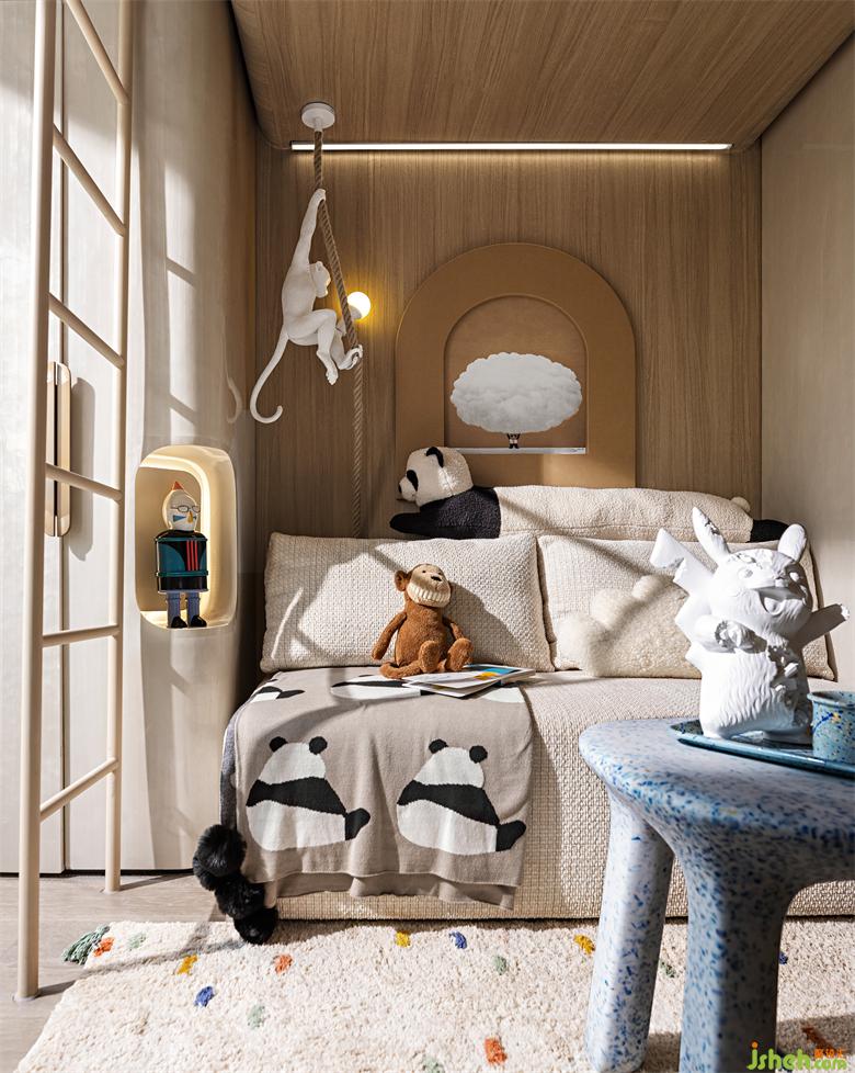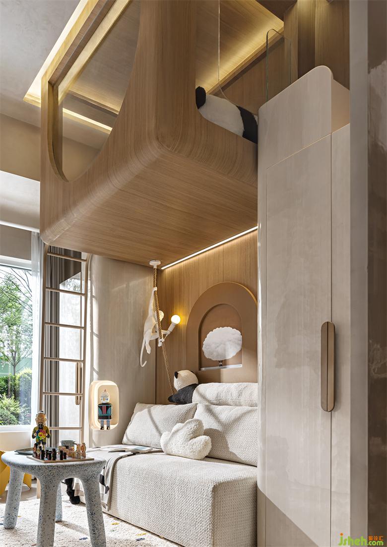 休閑桌椅呈現(xiàn)出孩子們學(xué)習(xí)與玩樂的狀態(tài),重慶樣板間設(shè)計(jì)兩邊大大的柜體放置了孩子們喜愛的玩具及書籍,那是孩子們在體力和想象力方面雙重自由飛翔的寶藏基地。