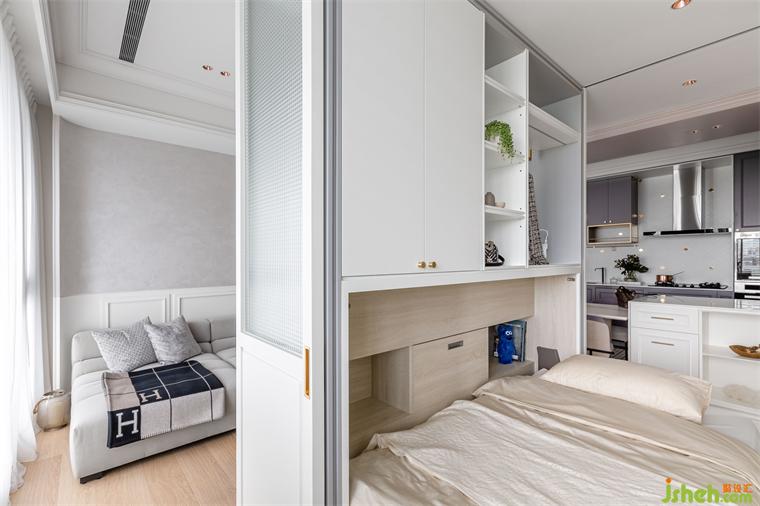 美型廚具座落入門玄關附近,高貴的藕灰色嵌入于墻面,家裝設計透過餐廳上方與收納柜體連接而成的藕色拱門做為空間的框景,界定餐廳與客廳的區(qū)域。在材質(zhì)上,金色的金屬點綴式的從廚房壁磚延伸至客廳家具桌腳,再跳躍到主臥旋轉鏡框,串聯(lián)起開放空間,并且營造屬于輕熟女的奢華質(zhì)感。