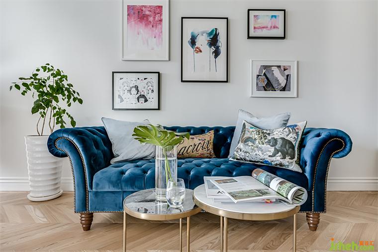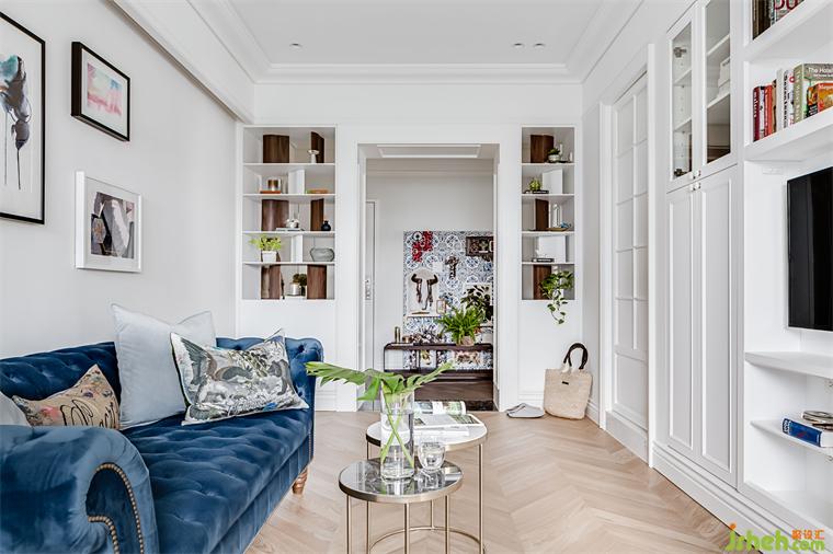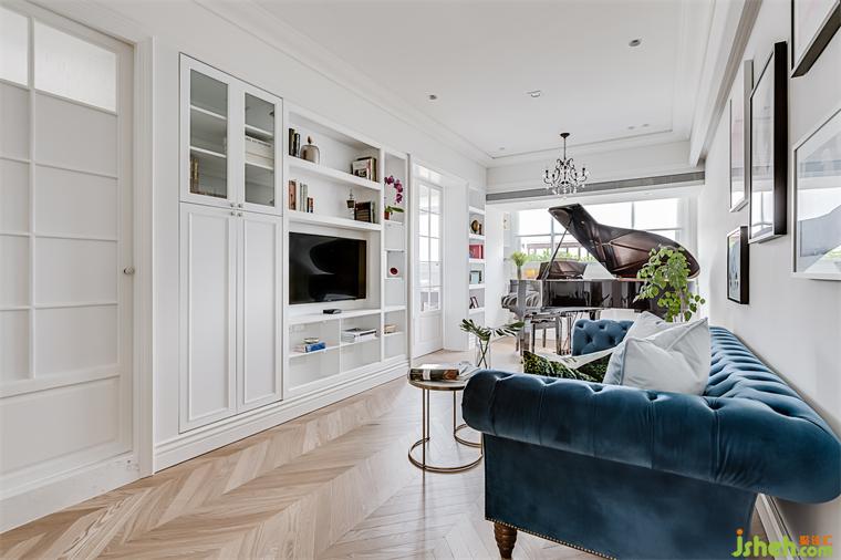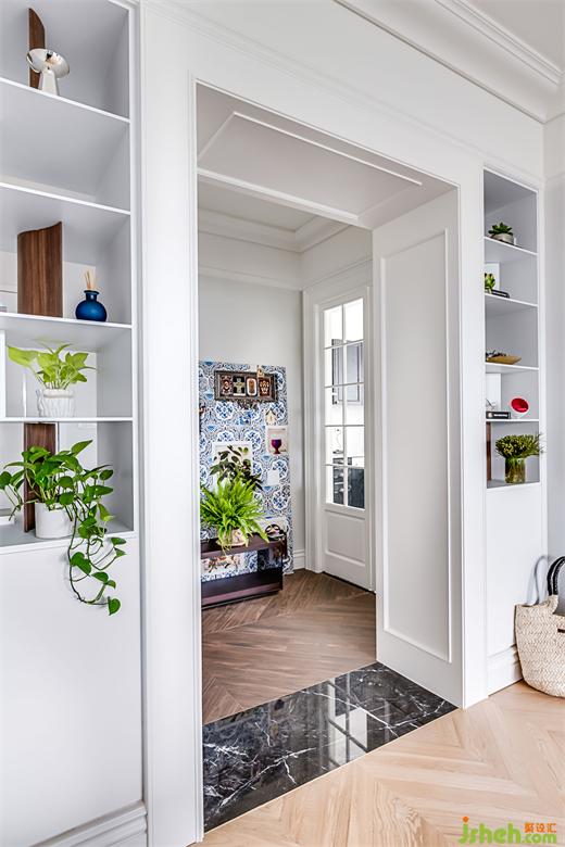 由于男女主人非常喜愛閱讀,也不是很??措娨?,設(shè)計(jì)師于是將隔開公共與私人空間的主墻設(shè)計(jì)成滿滿的書墻,也利用一部份比較深的空間做為大型物品收納柜,將展示與收納融合在同一面墻形成一致的古典語言。在同一面墻上,隱藏著一面進(jìn)入浴室的門片。隱藏門片一樣使用法式的格子做門片裝飾,推開門面,隨即會看到優(yōu)雅的馬賽克地磚,搭配銀狐壁磚和溫暖的胡桃木皮浴柜,構(gòu)成屋內(nèi)另一個美麗的法式細(xì)節(jié)。