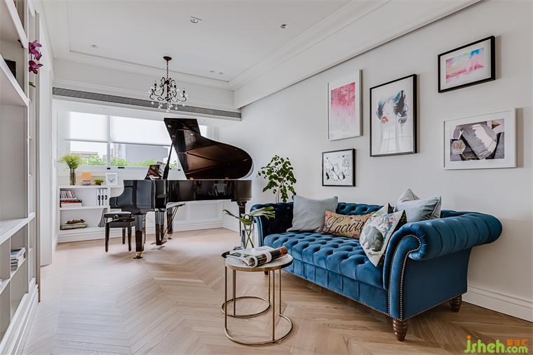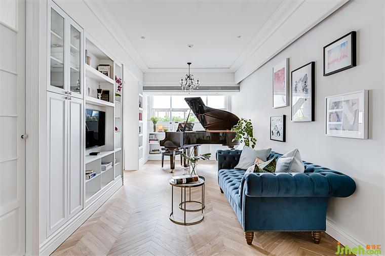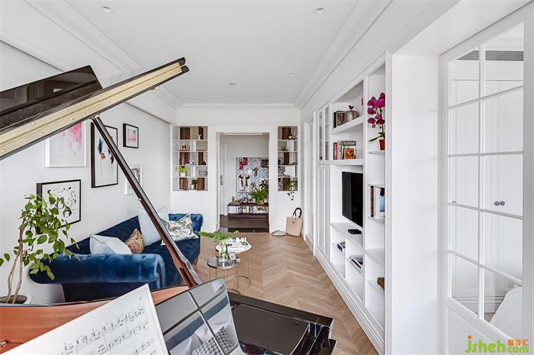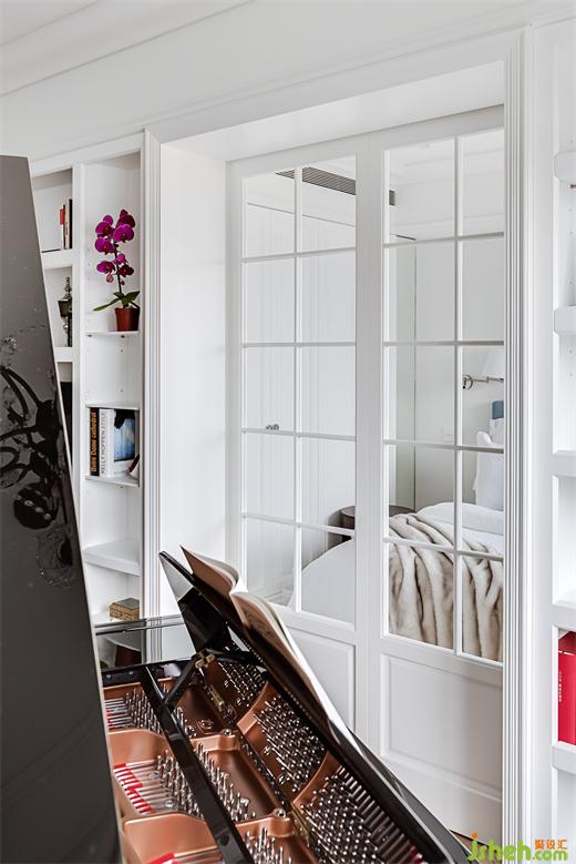 鋼琴后方的柱子是可以穿透到主臥書房的小空間,家裝設(shè)計(jì)師利用這個畸零角落做成一些層板,供客廳與主臥兩面使用。男主人喜愛寫作,書桌安置在主臥靠窗的角落,透過穿透的層板也可以隱約欣賞女主人彈琴的背影。