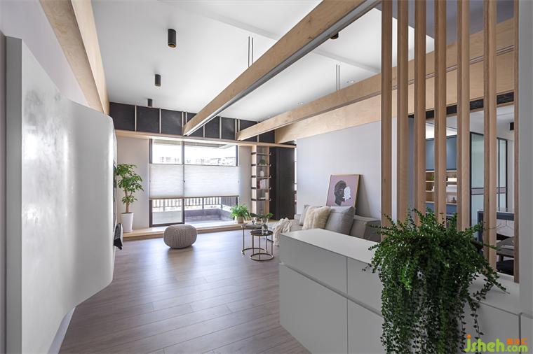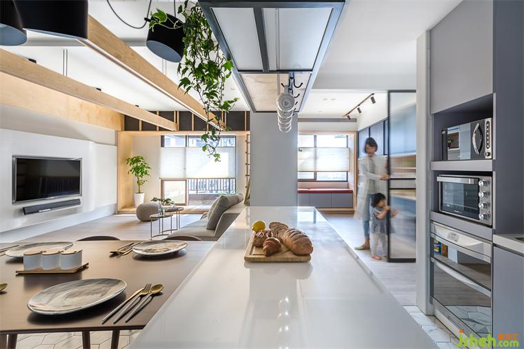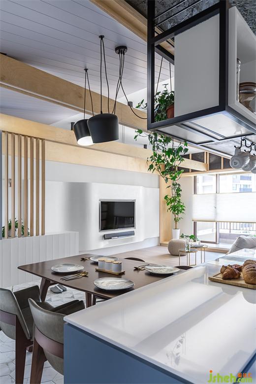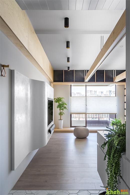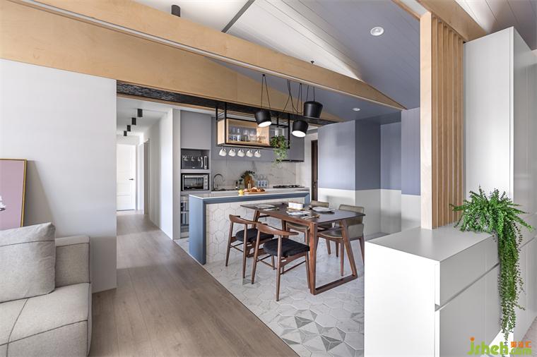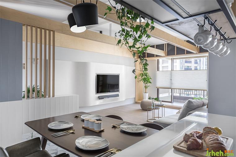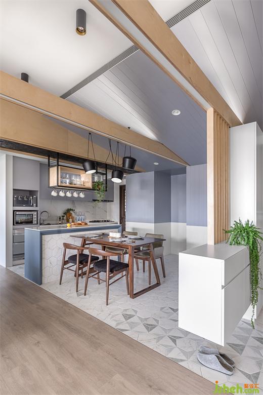 由大門進(jìn)入,映入眼簾的是一片柔和的弧形電視墻面,造型輕盈如紙片,材料使用木作,完成面上特殊白漆,光滑的質(zhì)感柔化了上方帶有強(qiáng)烈直線型的空間感。簡約的形體嵌入業(yè)主只使用基本機(jī)柜的需求,弧形的墻體橫跨整個客廳,尾端則變成細(xì)長的紙片插入于木框,消失于框景。午后的陽光輕輕的由陽臺灑入室內(nèi),不僅更突顯電視墻輕盈的質(zhì)感,更是溫暖了架高的木平臺,自然光溫暖的感染全室。與大門同側(cè)的便是開放式廚房,造形格柵鞋柜巧妙的隔出了業(yè)主所向往穿透性強(qiáng)的玄關(guān)功能。豪宅設(shè)計(jì)廚房配有完整機(jī)能性中島,兩側(cè)使用灰藍(lán)色立板,而地面的六角磚材質(zhì)則向中島正面延伸,就像由地面升起的柜體,上方有鐵件搭配木皮吊柜,利用不同顏色與材質(zhì)堆棧,讓中島成為餐廳的主題區(qū)域。