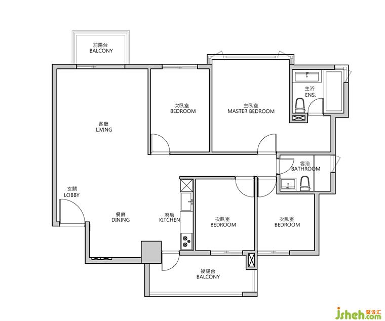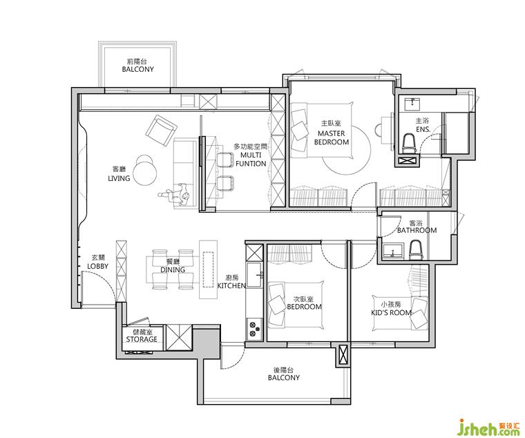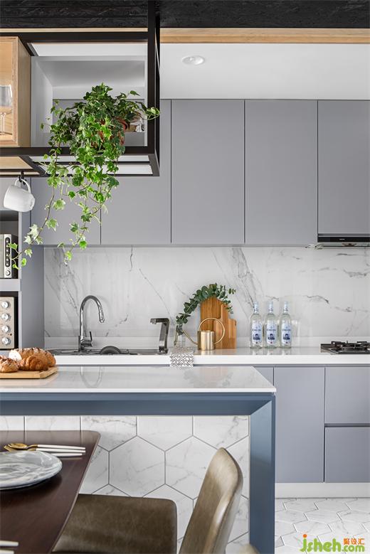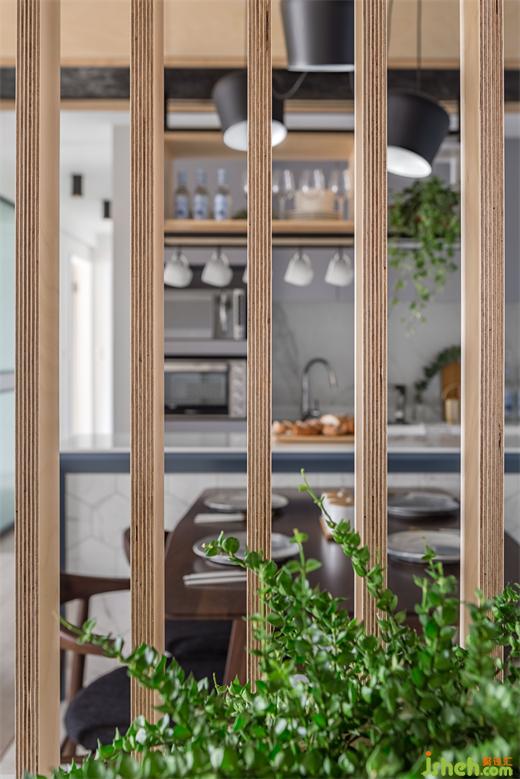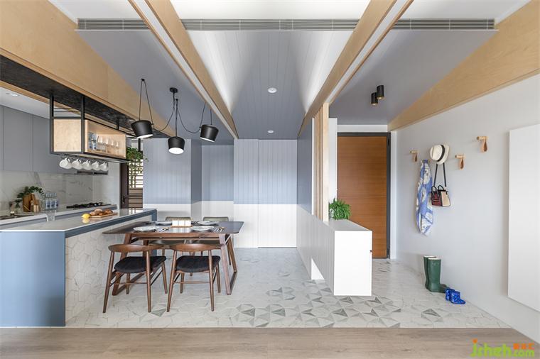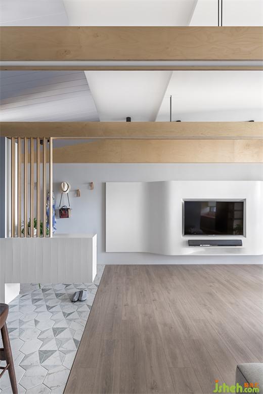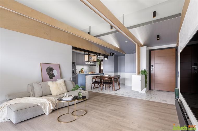 電視墻面塑造成柔和的弧形,造型輕盈如紙片,光滑的質(zhì)感柔化了上方帶有強(qiáng)烈直線型的空間感。與大門同側(cè)的便是開放式廚房,造形格柵鞋柜巧妙的隔出了業(yè)主所向往穿透性強(qiáng)的玄關(guān)功能。本住宅擁有良好屋高,廚房上方打斜的天花板實(shí)際上是仿歐式小木屋,設(shè)計(jì)團(tuán)隊(duì)巧妙的將吊隱式的冷氣機(jī)子隱藏于天花上方,只降低局部天花,并從墻面延續(xù)木屋的直線型木板至天花,色彩上也利用墻面上半部的灰色帶到斜天花,視覺上間接提升了天花的高度。另外為呼應(yīng)木屋結(jié)構(gòu)為發(fā)想,上方有四條木作橫梁將開放空間串聯(lián)起來。整體色系給與視覺上極簡,又帶有濃列對(duì)比的立體效果。