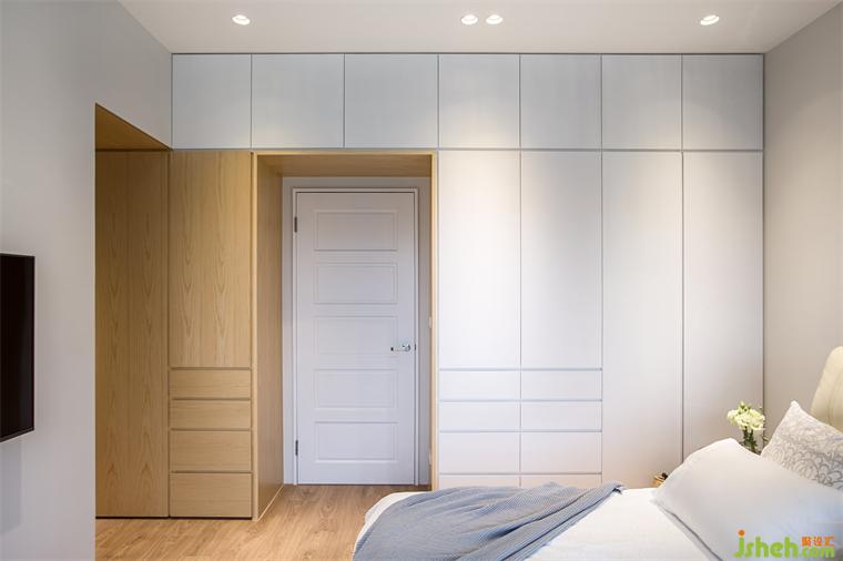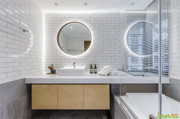 豪宅設(shè)計(jì)延續(xù)公共空間的大片窗景,主臥也有大片的窗戶,這里也使用樺木框來呼應(yīng)開放空間的設(shè)計(jì),在家中形成多個(gè)框景。一整面的衣柜設(shè)計(jì)滿足業(yè)主收納需求,主臥轉(zhuǎn)進(jìn)主浴之前,端景墻設(shè)有簡約的化妝臺(tái),符合女業(yè)主習(xí)慣站著化妝的習(xí)慣。進(jìn)入主浴,純白色帶有手感強(qiáng)烈的面包磚貼于浴室上半段,而下半段則是采用仿天然石材紋路的大片磁磚來營造簡約活潑的氛圍。延用公共空間的淺色樺木做為浴柜門片,除了有實(shí)用的收納功能之外,溫潤的材質(zhì)與冷調(diào)的磁磚做結(jié)合,不但平衡整體色系,更是為冰冷的浴室注入溫潤質(zhì)感。墻面上掛有大片圓形鏡面,背后藏有LED的間接光,巧妙的藉由兩側(cè)反射材質(zhì),形成有趣的日全蝕影像,也達(dá)到視覺上的延伸與放大,使業(yè)主享有舒適沉淀身心的泡澡好時(shí)光。
