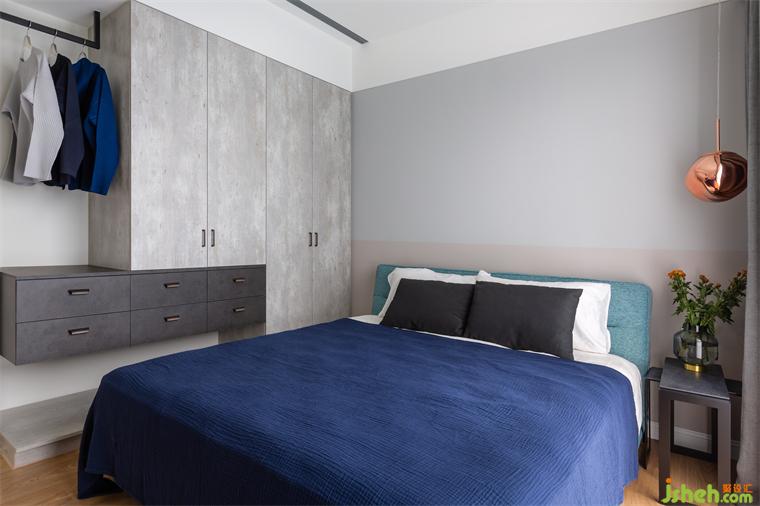 全室空間,無論是電視柜,玄關(guān)柜,一直到主浴的柜體,皆有溫暖的橄欖綠搭配金屬手把,為黑白灰的空間做加溫的動(dòng)作。來到主臥,深藍(lán)色的主題墻,搭配玫瑰金吊燈,營(yíng)造溫暖又神秘的私人休憩空間。男主人擁有眾多的時(shí)尚單品以及收藏品,彷彿置身于精品館。