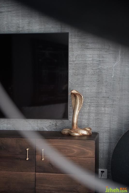 ——軟裝幾乎清一色的煙熏色橡木加胡桃木,木紋的質(zhì)感并不完美,因此更有時間流逝的感覺。墻飾與擺件選了很多動物化石,算是小小地補償一下小時候做考古學家的夢想。