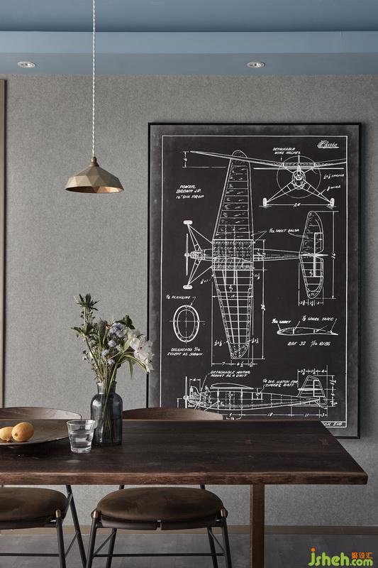 業(yè)主從小懷揣著考古夢,雖然現(xiàn)在并未實現(xiàn)當年的夢想,但是我們依然為此去考慮一些細節(jié),做舊質(zhì)感的原木餐椅搭配老式皮革椅子,它會隨著使用者日積月累的摩擦而變得更有歷史感,設計師挑選的老式機械飛機模型圖,也再詮釋主人對遠方和機械的偏愛。