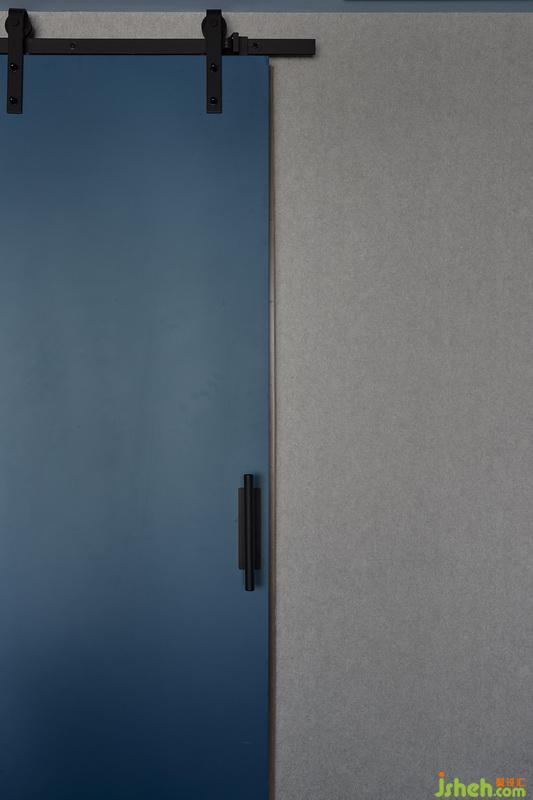過道如果按獨立來區(qū)分其實并不長,因為他是可以融合在整個起居室空間的,我們拆掉了原有的衛(wèi)生間開門,用了一個更純粹的深藍色谷倉門,讓空間更加充滿趣味和探索。