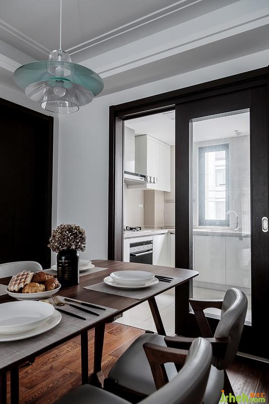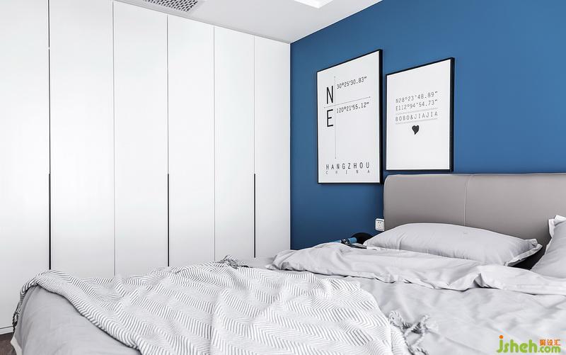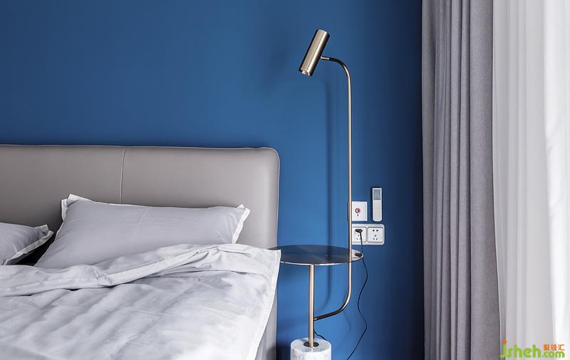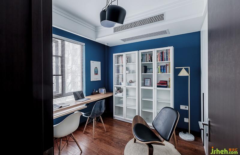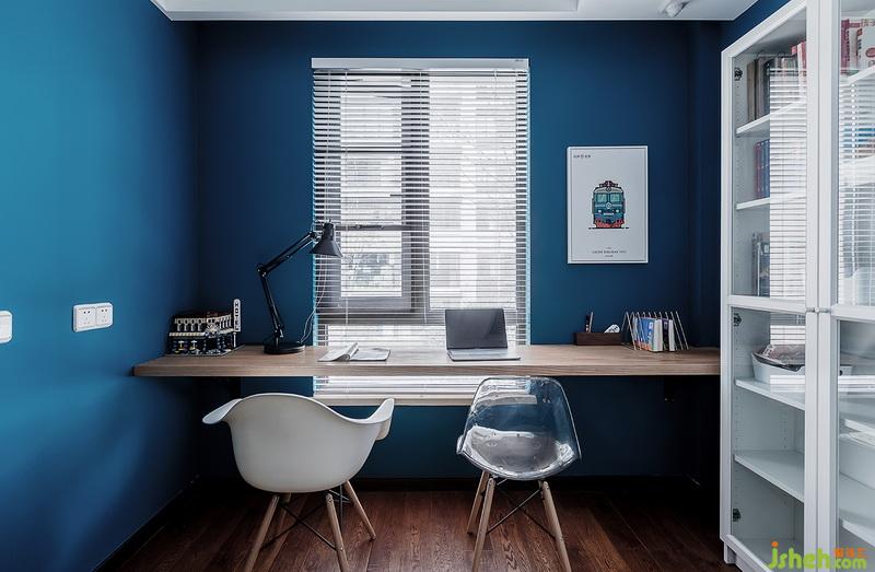▲書桌的面是一整塊胡桃木桌面,黑色的工業(yè)風(fēng)裝飾帽子燈和臺燈,在藍色墻面漆下自然活波起來。