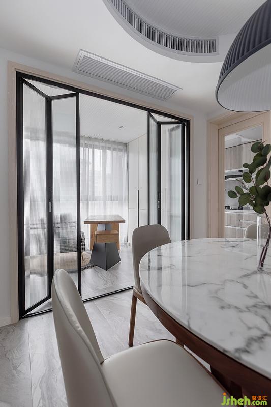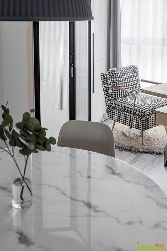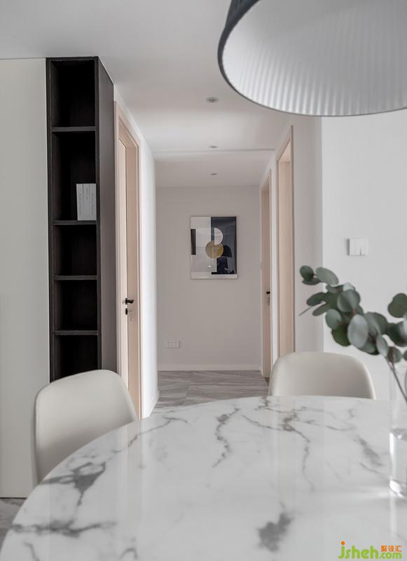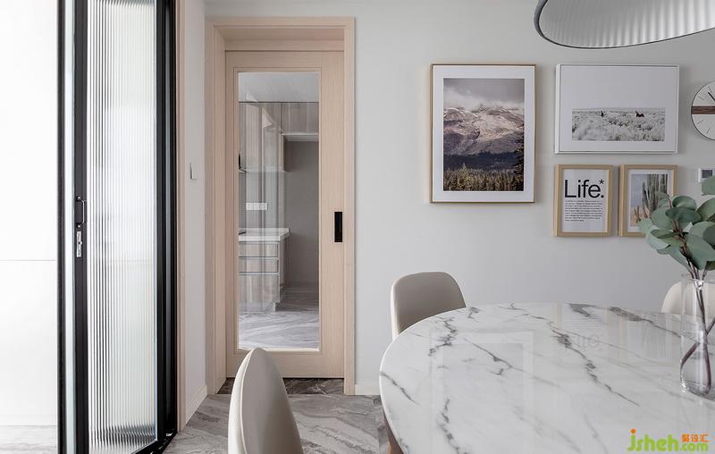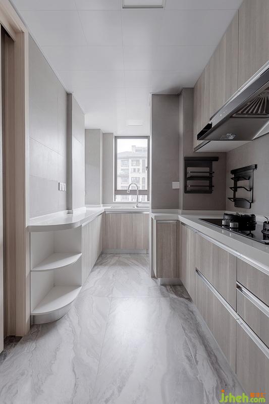 廚房采用的是雙飾面材質(zhì),擁有了天然木紋的質(zhì)感,同時兼顧后期油漬的清洗;而衛(wèi)生間淋浴房則選擇了天然的火燒板,拉槽處理+火燒面特征,使得淋浴防滑和自然人文氣息。