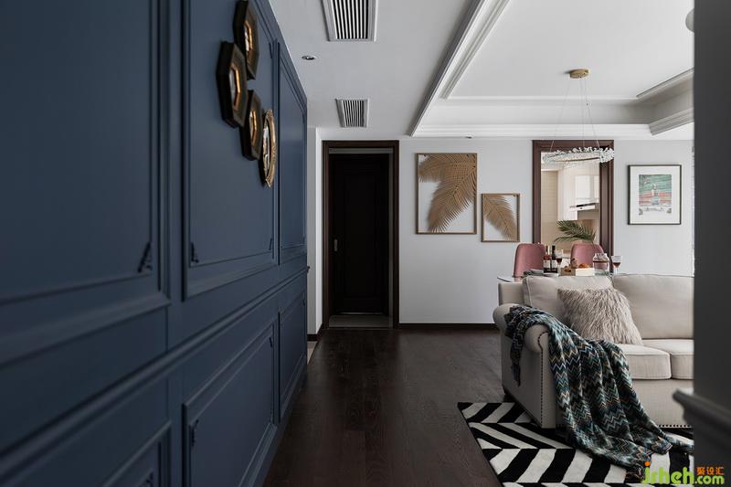 原戶型三房設計,不過客臥的空間日常無人使用,所以在方案設計前期我們把它進行了重新改造,大面積儲藏+獨立書房+兼顧客臥功能。我們除了滿足第一個要求以外,還做了兩個特別的隱蔽式設計處理。折疊式墨菲床,可以在使用的時候打開,而因為無法前期預埋中央空調,所以我們把壁掛式空調隱藏在柜子里,也充分考慮了出風和冷飲水的特殊處理。