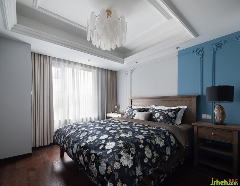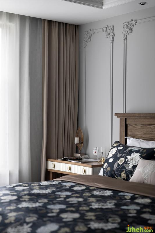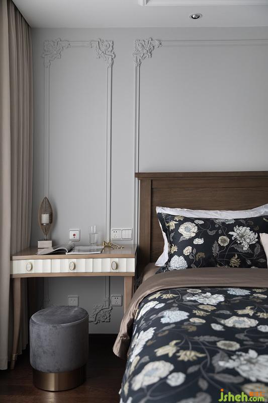 主臥設計師并沒有設計和客廳一樣的木護墻,考慮到空間的每一寸尺寸都彌足珍貴,物料表篩選后,PU線條便出現(xiàn)在我們的眼前,其硬度的穩(wěn)定性和后期的打理完完全全超過石膏線,“復古”的角花搭配原木色家具,而拼色的背景處理,也讓整個空間不在悶沉,主張和個性都在發(fā)聲。