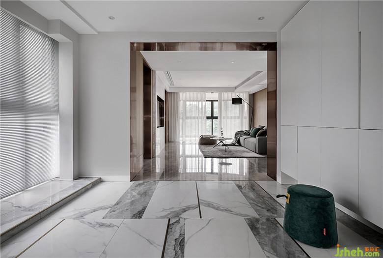 傳統(tǒng)意義的大空間戶型設(shè)計(jì)中,玄關(guān)會(huì)去做一些“圍擋”,但此案中我們并不希望去做這些常規(guī)技巧,空間的通透和儀式感才會(huì)有張力,搭配整體落地玻璃窗讓光線融合。
