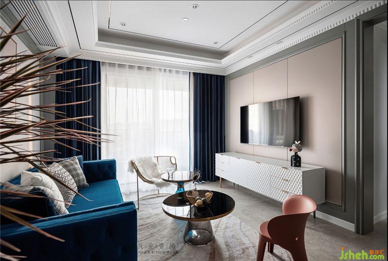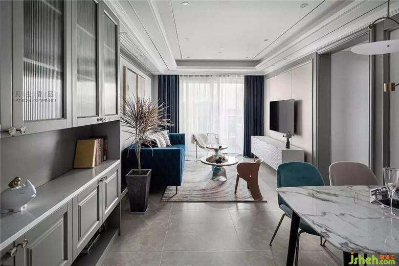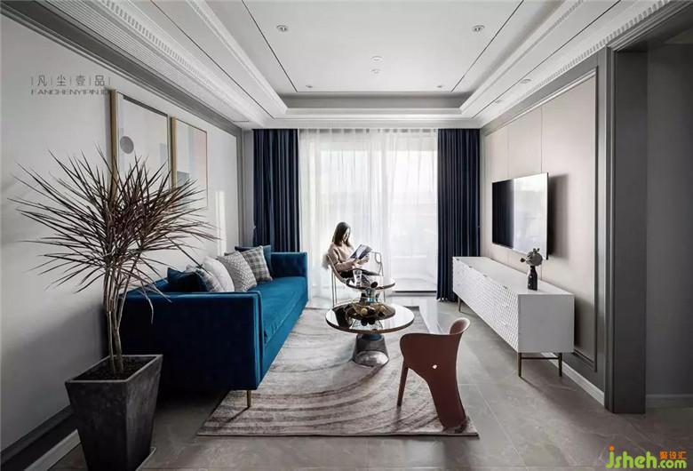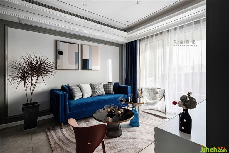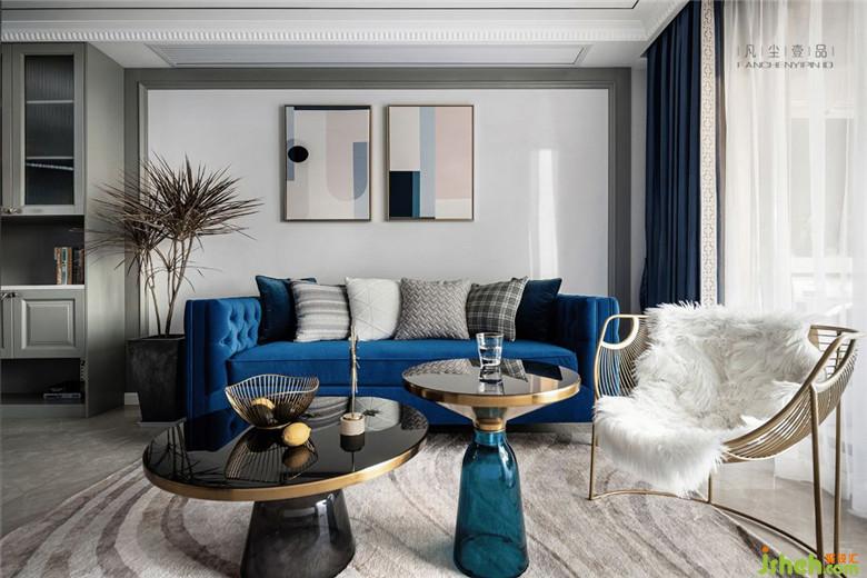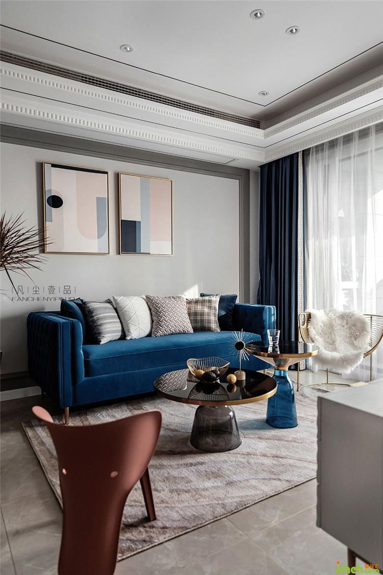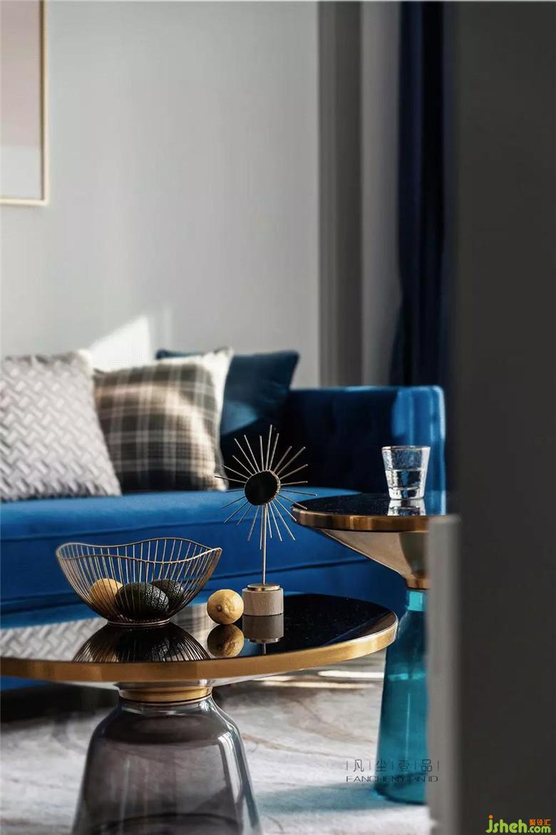 天鵝絨材質(zhì)沙發(fā),細(xì)膩的觸感搭配金屬鑲邊玻璃茶幾,讓客廳空間氛圍透出輕奢的氣味,經(jīng)典藍(lán)主色調(diào)貫穿其中,在不同材質(zhì)上表現(xiàn),絲絲相扣。