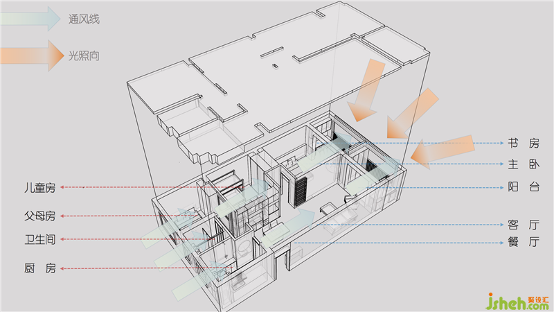 方案:利用多澆筑的父母房空間,打通兒童房和父母房之間的墻壁,裝修設(shè)計(jì)雙面造型內(nèi)窗,可以同時(shí)滿足日常采光、通風(fēng)和私密性。另整個(gè)室內(nèi)空間一共設(shè)計(jì)預(yù)留三條過(guò)堂風(fēng)線,保證每一個(gè)空間都不是密閉的空間,從而解決南方梅雨季的回潮問(wèn)題和家里每個(gè)空間空氣換新。