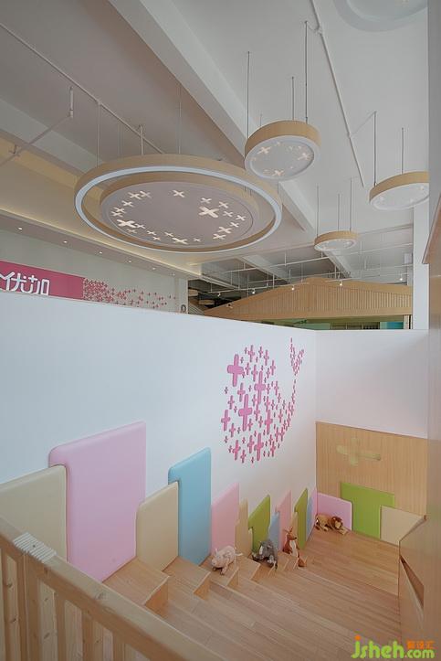 墻壁用品牌符號(hào)組成的鯨魚圖案,木質(zhì)的階梯與圍欄以及階梯上擺放的動(dòng)物擺件,讓孩子們仿佛身處于大自然當(dāng)中。圍欄與階梯的邊角統(tǒng)一采用圓弧形護(hù)角處理,以及彩色的隨機(jī)護(hù)墊墻裙拼接,為您的孩子創(chuàng)造出安全并具有趣味的空間。設(shè)計(jì)公司