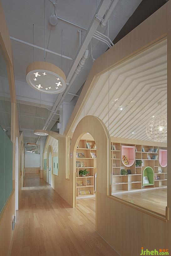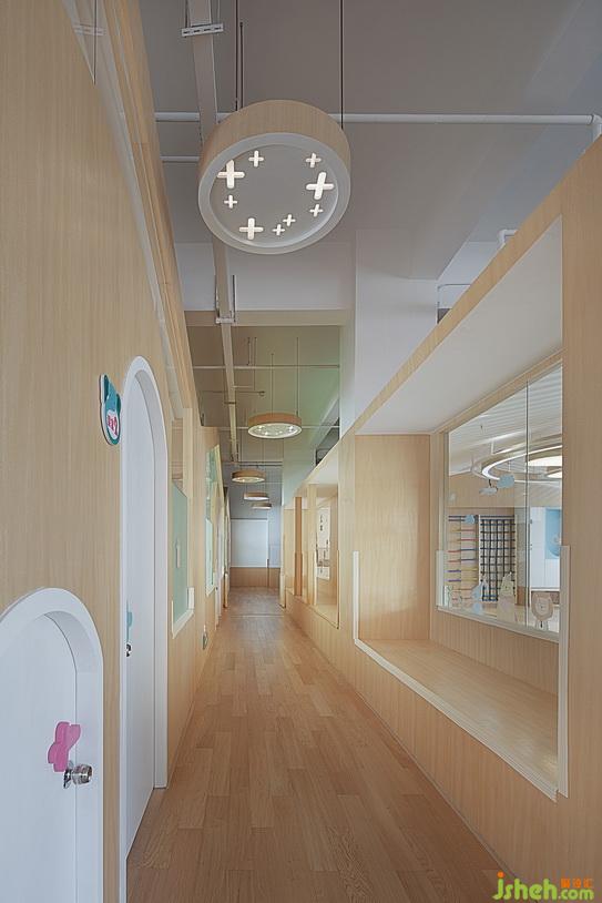 走廊大面積使用原木色與白木的搭配,讓整個(gè)環(huán)境看起來清新而自然??紤]到孩子會(huì)攀爬,窗臺(tái)及窗戶玻璃下方的陽角處統(tǒng)一采用軟膠護(hù)邊,以保障孩子安全自由的玩耍。設(shè)計(jì)公司