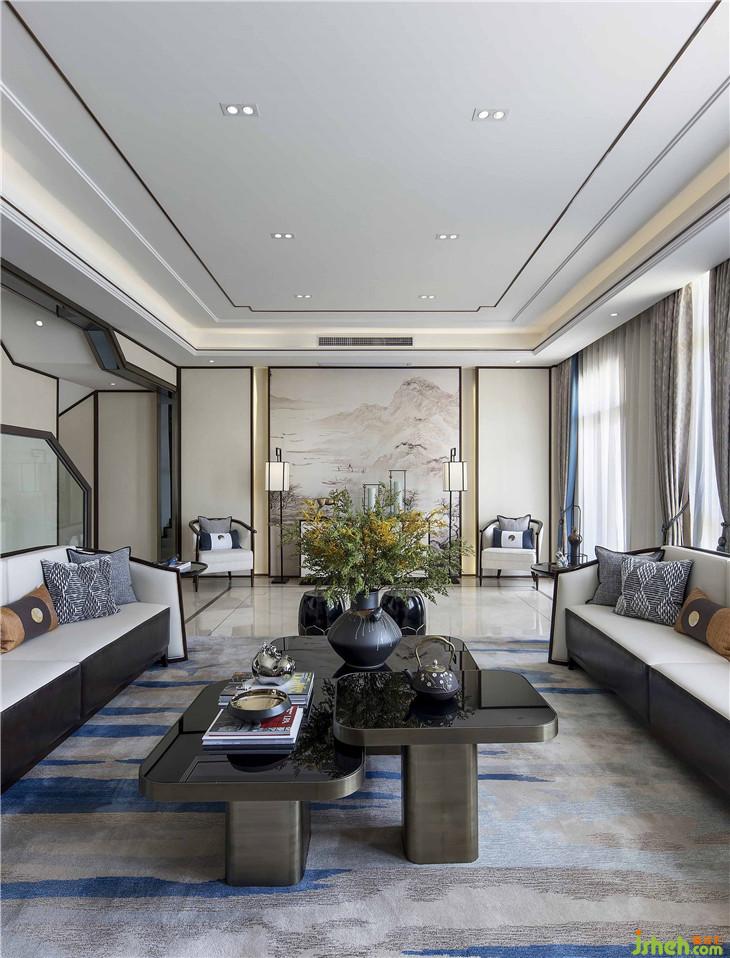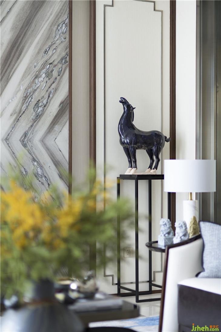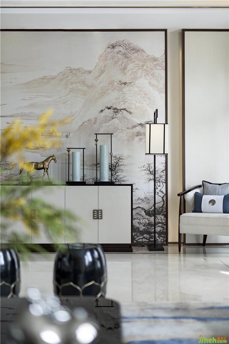客廳空間清朗開闊,左右通透的玻璃窗,簡練的布置和精美的裝飾,讓人有賓至如歸之感。入口門廳處,背景墻為一幅極為清雋的人文山水畫卷圖,近乎白描的線條,抒寫著山水悠然意境,讓自然情趣在空間自然彌漫,兩側(cè)放置簡雅的新中式地?zé)簟⑷σ?,將《宋史》中所提及的“耳目清曠,不設(shè)機(jī)關(guān)以待人,心安閑而體舒放”的自在感納入空間。