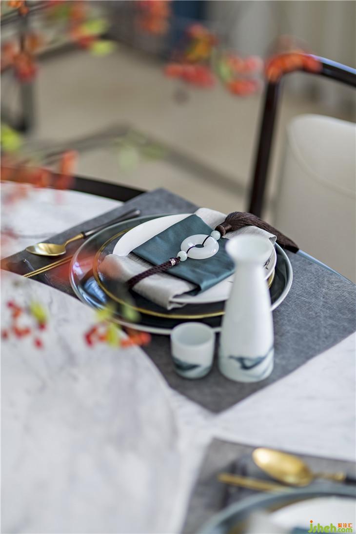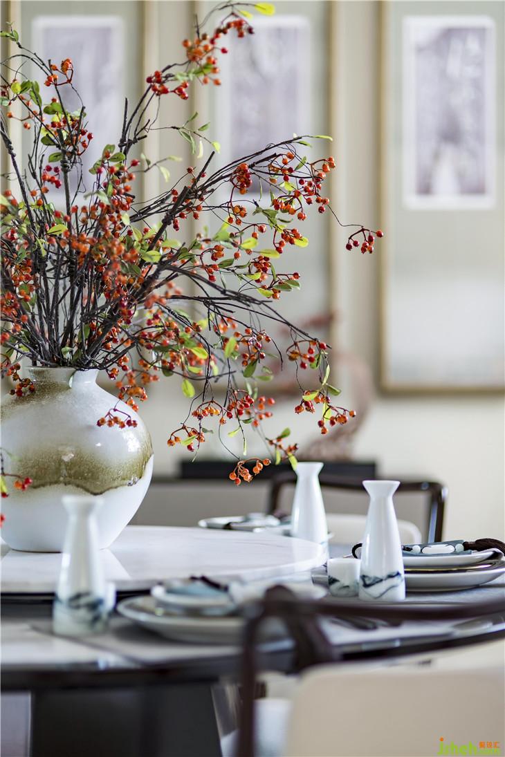 簡約的空間形制,給予人一種回歸自然、俯仰自得的圓融自在感,傳統(tǒng)而溫馨的圓桌,中式白瓷搭配肆意生長的枝椏、紅果,別有一番鮮麗動人的意韻,居住的詩意成了餐桌上一小片風(fēng)景。
