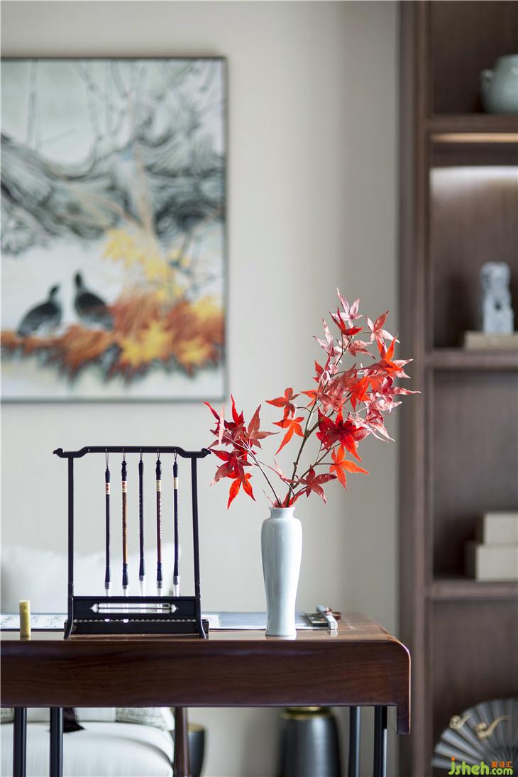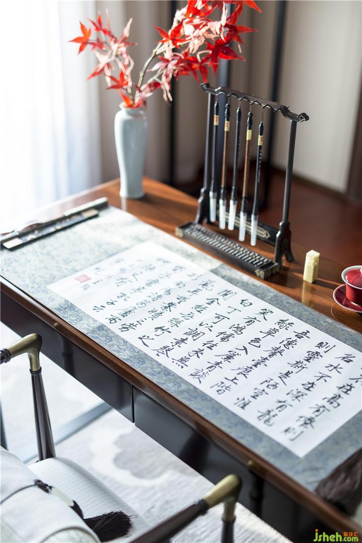 中式風(fēng)格的空間,自然流露出一種經(jīng)久不息的古典氣質(zhì),以高潔素雅為尚。在書法室的呈現(xiàn)中,清貴之氣與書卷氣交融?!安灰丝漕伾?,只留清氣滿乾坤,”元代詩人王冕的詩句,洋溢著磊落浩然之氣,也凝煉在這個空間中。