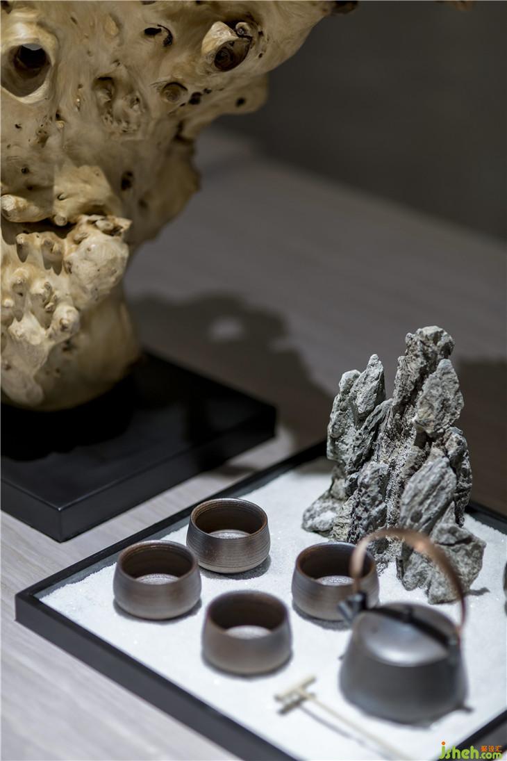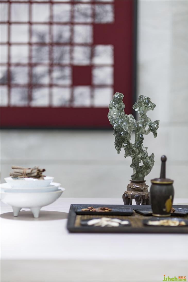 層層疊疊的白色垂簾,山水氤氳的清雋之姿淡淡描摹其上,一張未經(jīng)雕飾的木桌,設(shè)計整體上力求突出中國傳統(tǒng)的美學(xué)精神,營造處一個能夠凈化心靈、安養(yǎng)心神的簡凈空間,靜享生命中清淡的歡愉,在杯水茶盞、筆墨棋格間,尋覓生命最本真的悠游狀態(tài)。