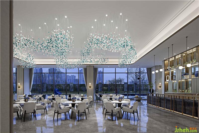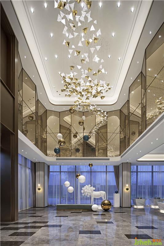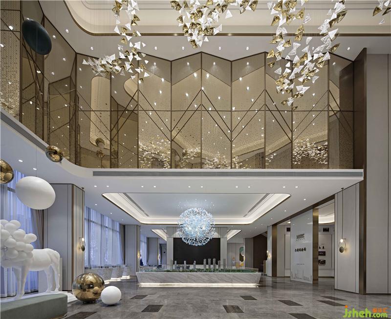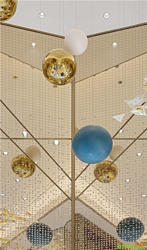 金色與透明相間的幾何水晶吊燈,看似無序?qū)崉t規(guī)律地串聯(lián)起一個灑脫、未來感十足的現(xiàn)代酷炫空間印象,與接待臺背景墻燈光、墻面裝飾線條以及接待臺立面造型的規(guī)律秩序形成視覺上的互補,讓觀者不斷地產(chǎn)生期待與驚奇。裝修設計