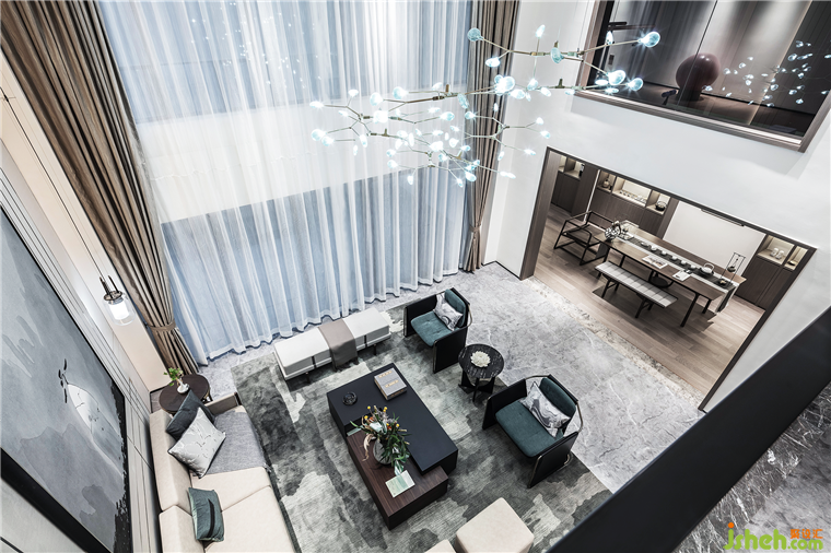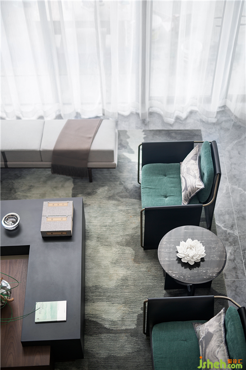 拾級(jí)而上,俯瞰挑高的會(huì)客廳,心生登高望遠(yuǎn)的豁達(dá)心境。溫潤的家居色彩,對(duì)稱的空間序列烘托下,東方的柔情與灑脫恣意流動(dòng)與交融,一張墨青色地毯,將空間的詩意如水墨般暈染開來。