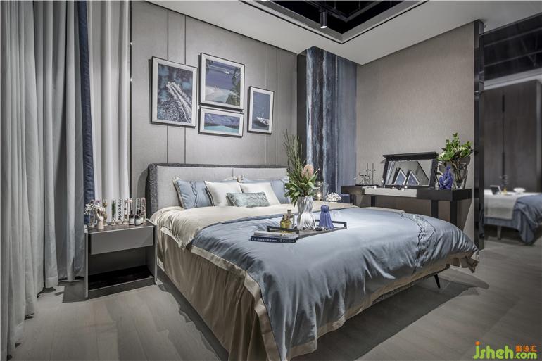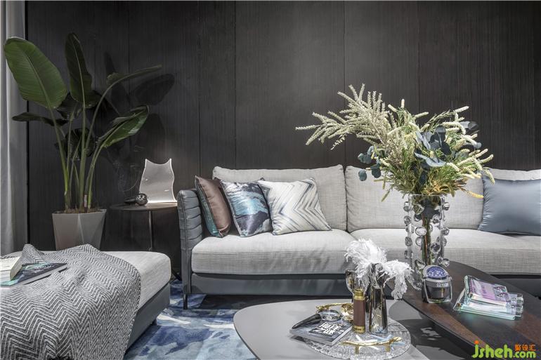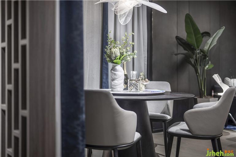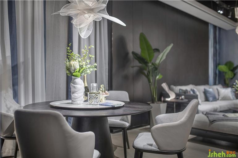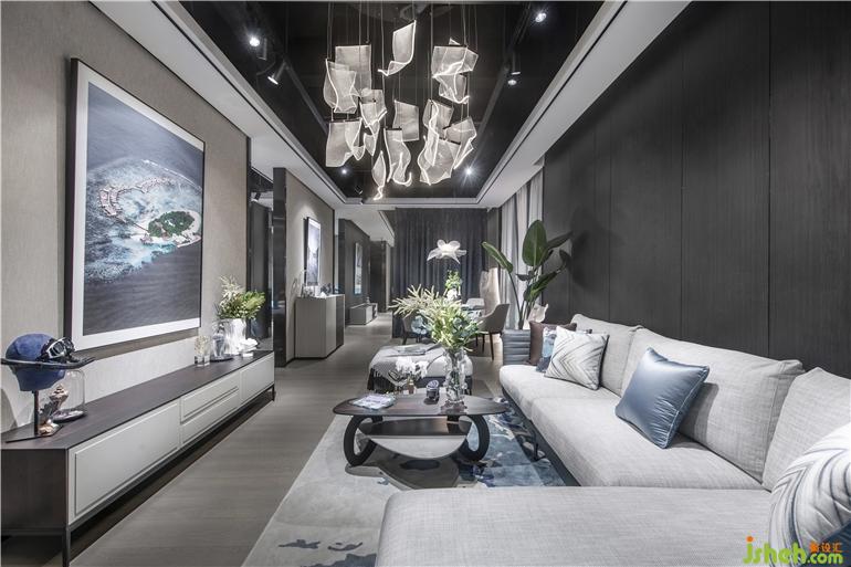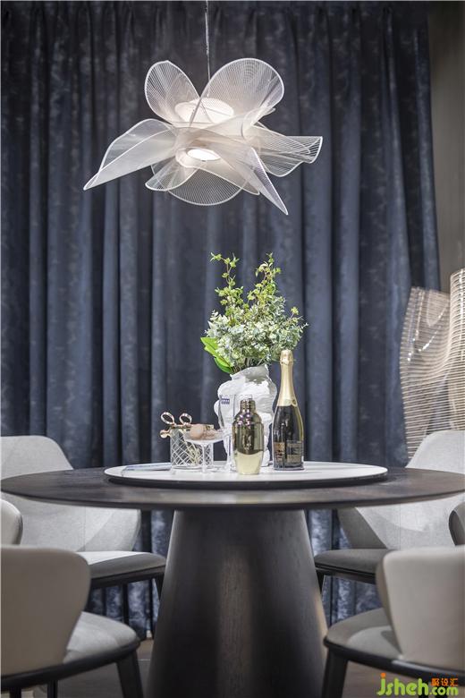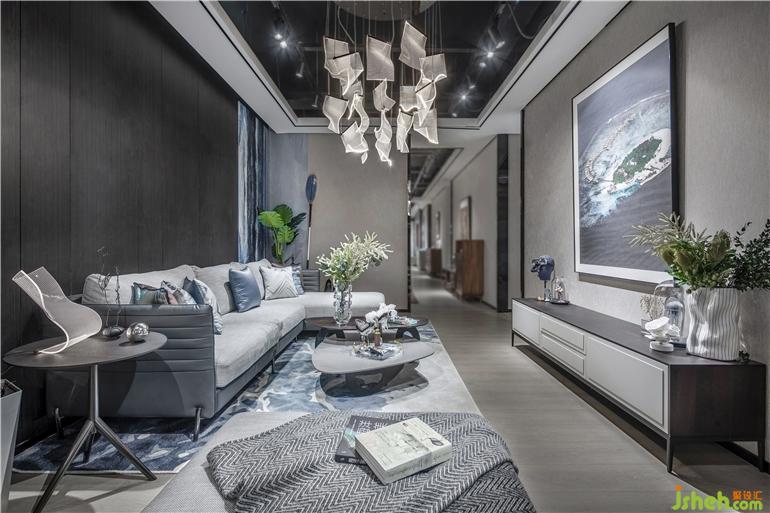 所有的家居都來(lái)自設(shè)計(jì)師精心的設(shè)計(jì),定制出各式不同的圖案,展廳設(shè)計(jì)將海洋元素巧妙地運(yùn)用到電視背景墻、掛畫(huà)、地毯、窗簾布藝之中。用漸變的藍(lán)色,掌握了色彩的藝術(shù),將家居物件靠枕、單椅進(jìn)行點(diǎn)綴,時(shí)刻凸顯海洋氣息;提取海面波光粼粼的元素作為地毯的圖案,吊燈的形狀提取了海洋生物的特征;看似簡(jiǎn)單的茶幾,其實(shí)設(shè)計(jì)師在細(xì)節(jié)上做了“手腳”,桌腿是透明的玻璃,搭配波光粼粼的地毯,像是若有似無(wú)的浮在海面上。