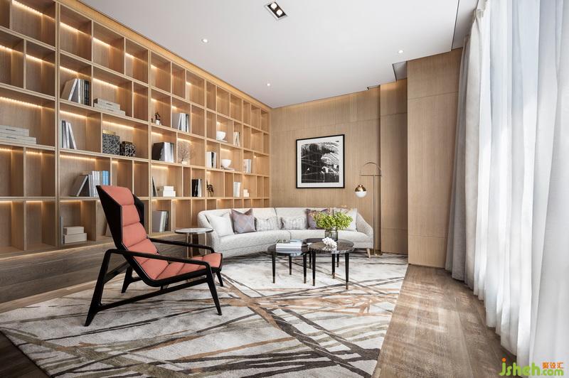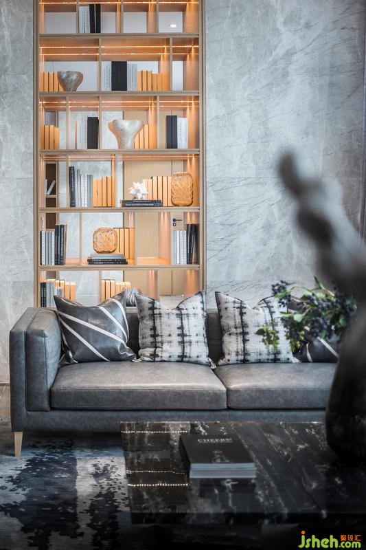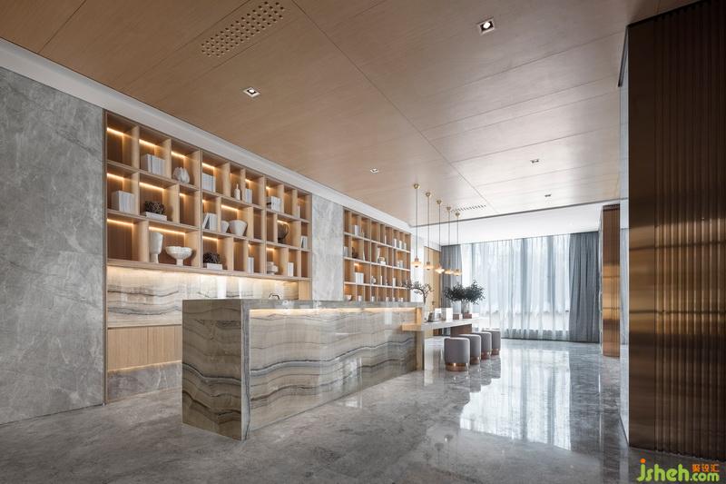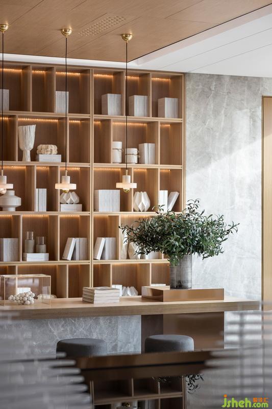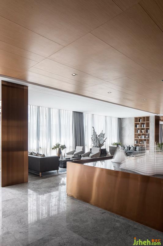 水吧接待區(qū),層疊遞進(jìn),造就視線錯落。玉石紋理臺面,又與前廳接待臺整體對望呼應(yīng),再次強化“長江之水”意境。摒棄傳統(tǒng)功能單一的水吧概念,與書吧結(jié)合,豐富空間形式?!笆覂?nèi)設(shè)計師利用勾縫手法將立柱鑲嵌細(xì)致金屬,在嚴(yán)格校準(zhǔn)線、面、體之余,刻畫線型序列,實現(xiàn)粗獷與細(xì)膩碰撞,細(xì)節(jié)上營造流動性環(huán)境氛圍?!碧峒按颂幜咙c設(shè)計師方磊如此表示。