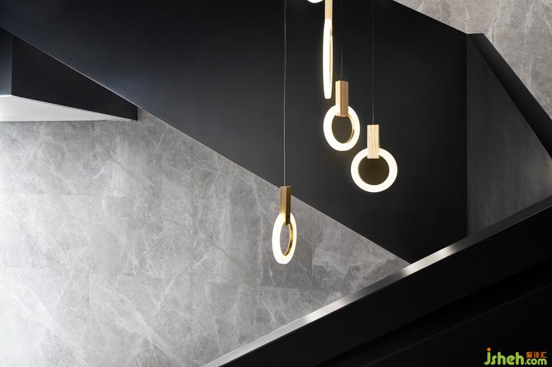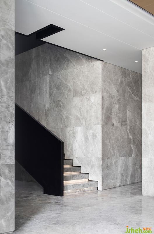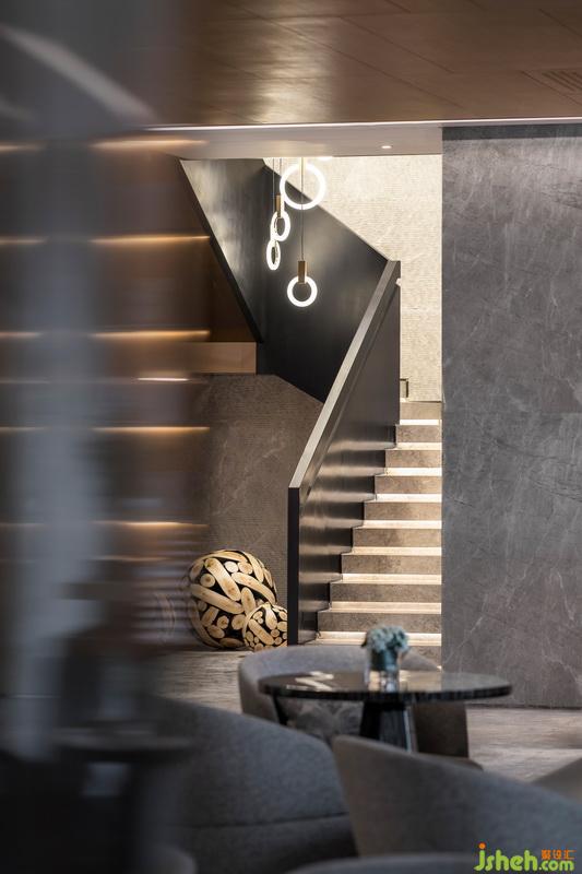 樓梯間從臺階到欄桿扶手的細(xì)部處理一絲不茍,臺面下方燈帶增加縱深感,石材與拉絲不銹鋼鍍黑鈦對比鮮明,樓梯扶手的線條感與石材毛鑿面肌理交融構(gòu)成其建筑形態(tài),充滿力量感。