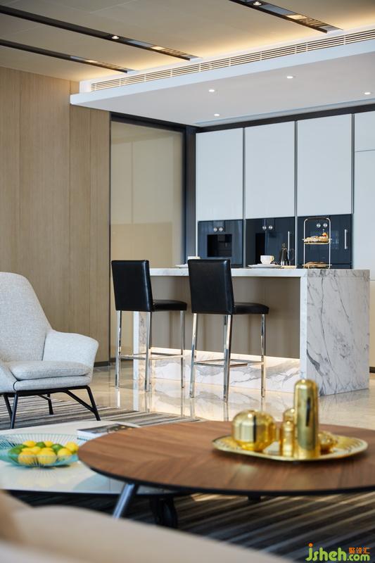 因勢利用L型墻體并結(jié)合人體工學(xué)打造懸浮柜體,同時和藏有暗門的木飾面一體布局。與之對望的島臺、櫥柜,同樣巧妙地將功能性融入體塊,在黑白相映間凸顯材質(zhì)的碰撞。